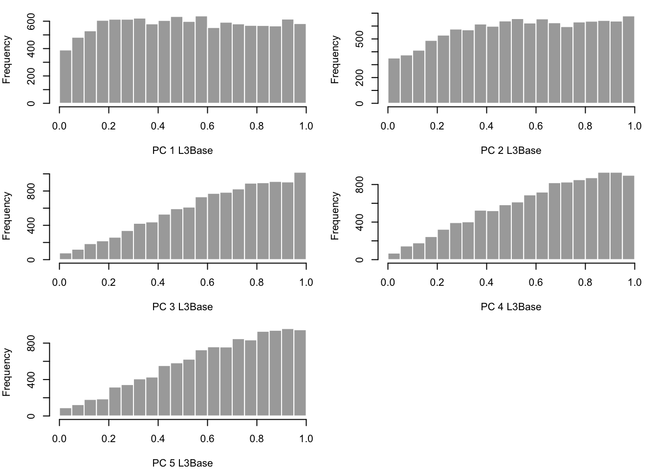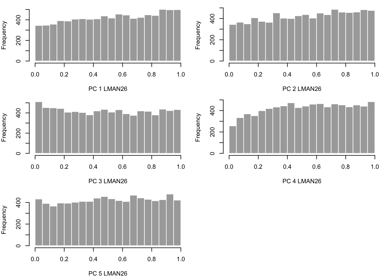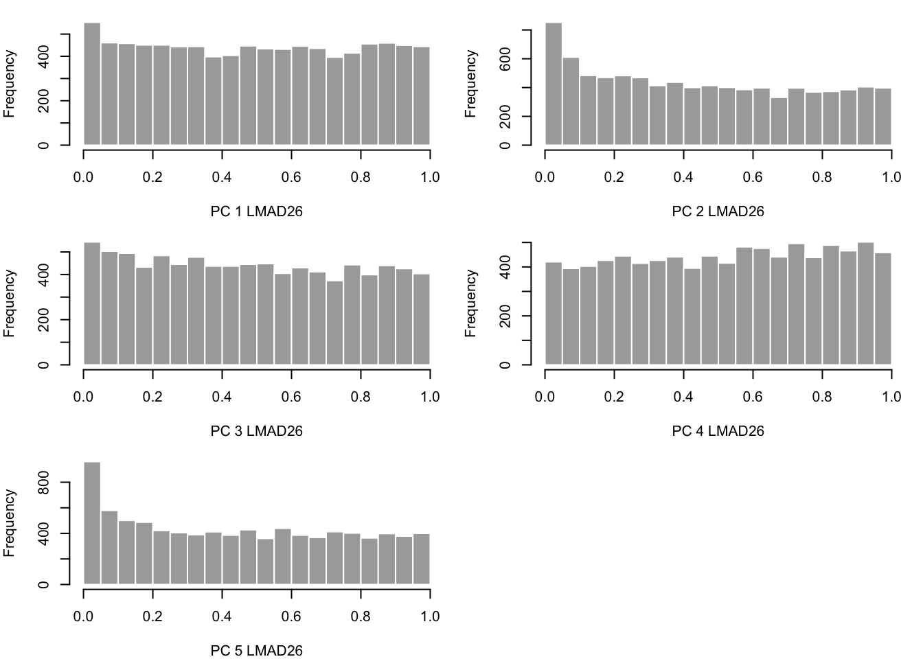 hist(pvals[,x], border="white", col = "darkgray", main="", breaks = 20, xlab = paste('PC ',x,' ',alltissues[i],sep=""))