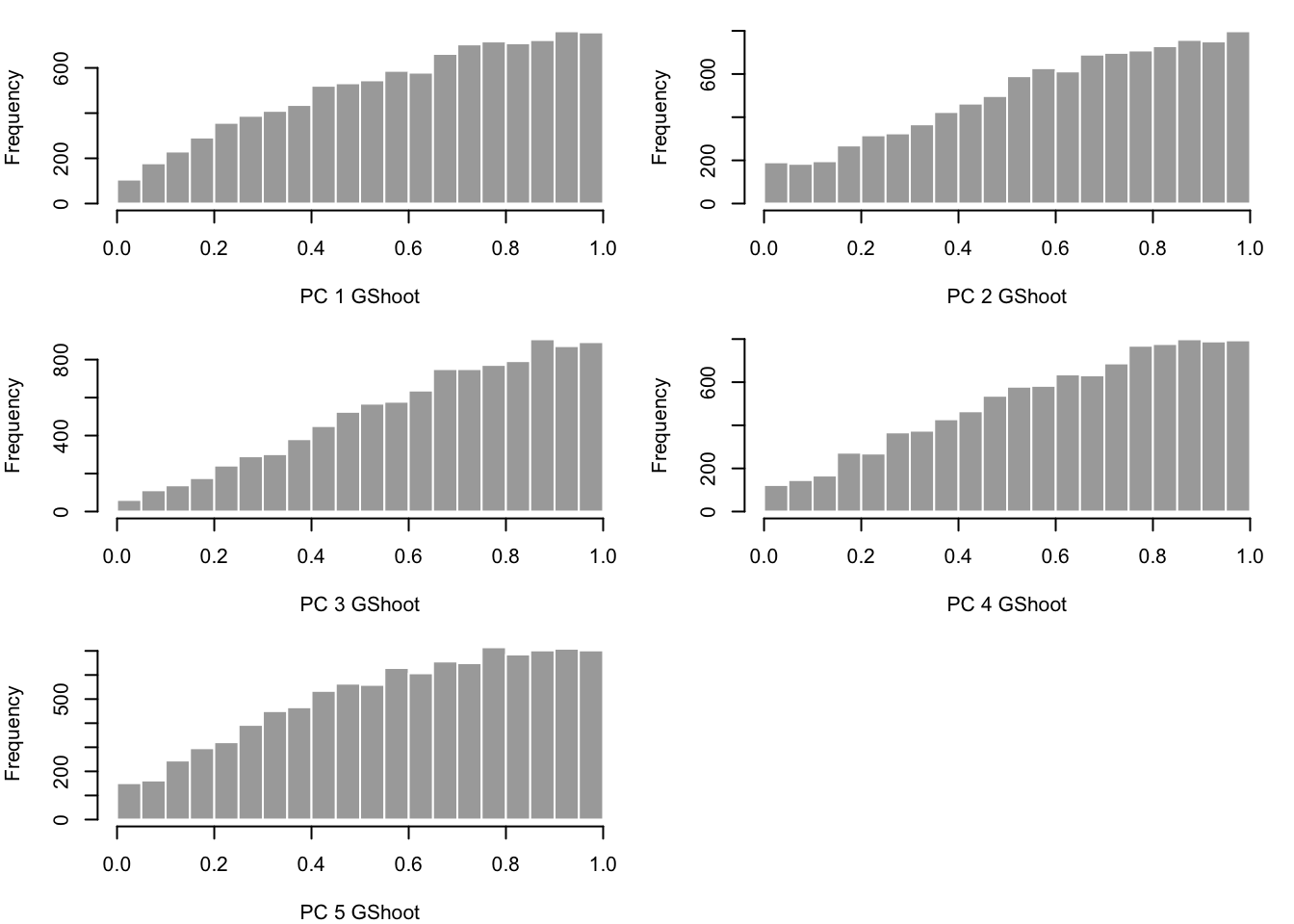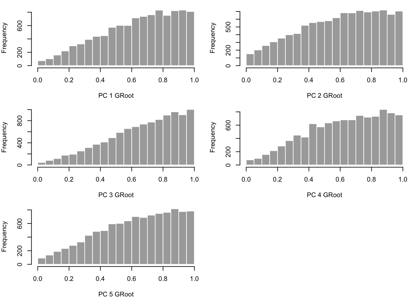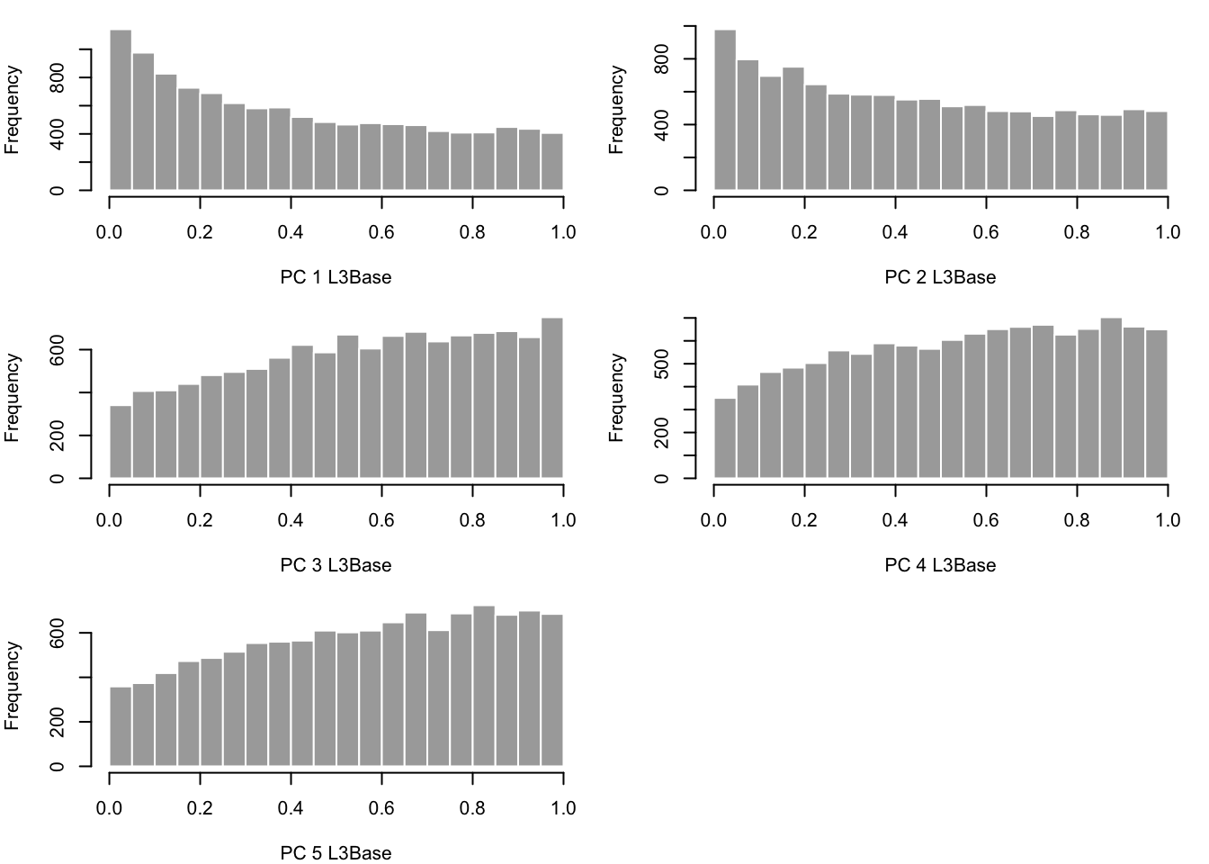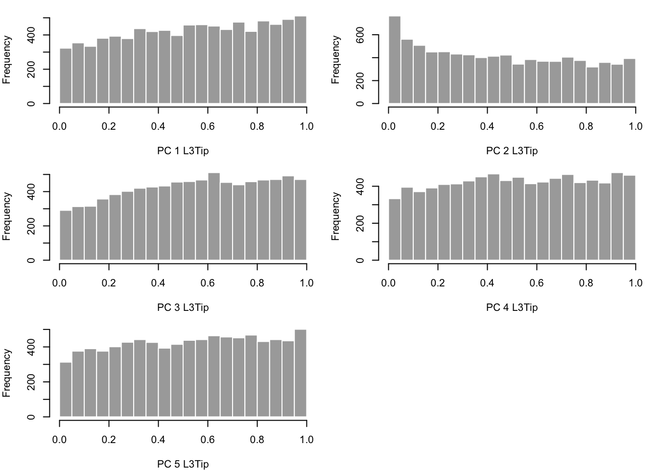 hist(pvals[,x], border="white", col = "darkgray", main="", breaks = 20, xlab = paste('PC ',x,' ',alltissues[i],sep=""))