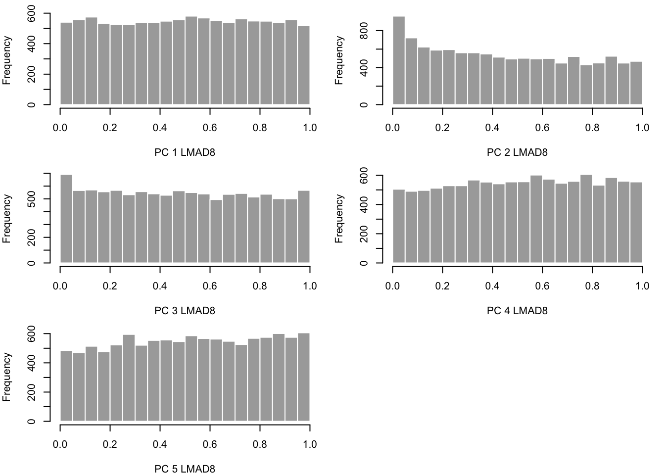 pvals = matrix(unlist(alltissueresults1120[[i]][4,]), ncol=5, byrow=TRUE) #each row corresponds to a gene, columns are to PCs