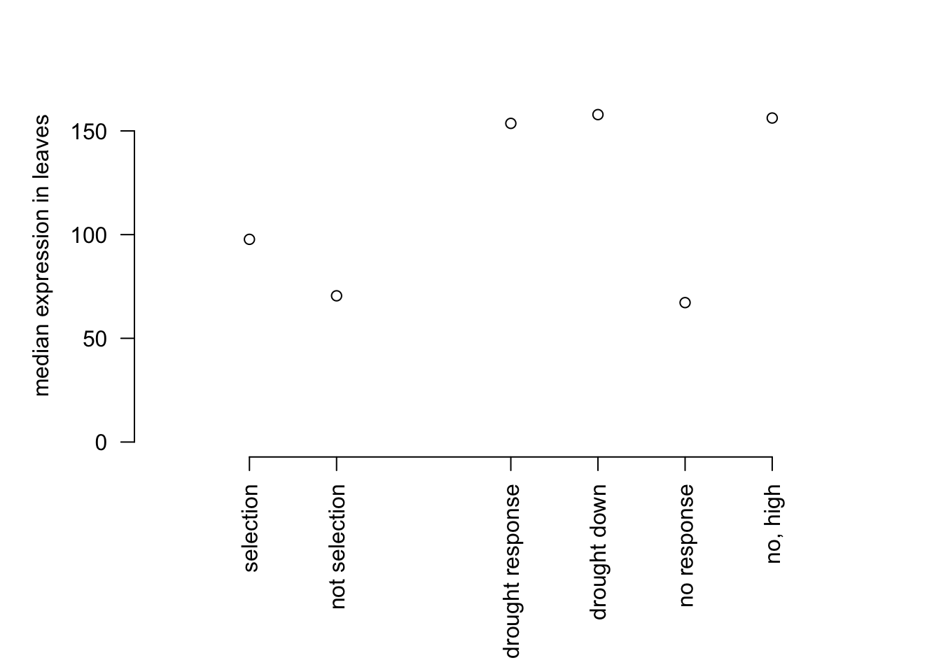 bty="n", ylim=c(0,180), xaxt="n", yaxt="n",ylab = "median expression in leaves", xlab="", xlim = c(0,6))