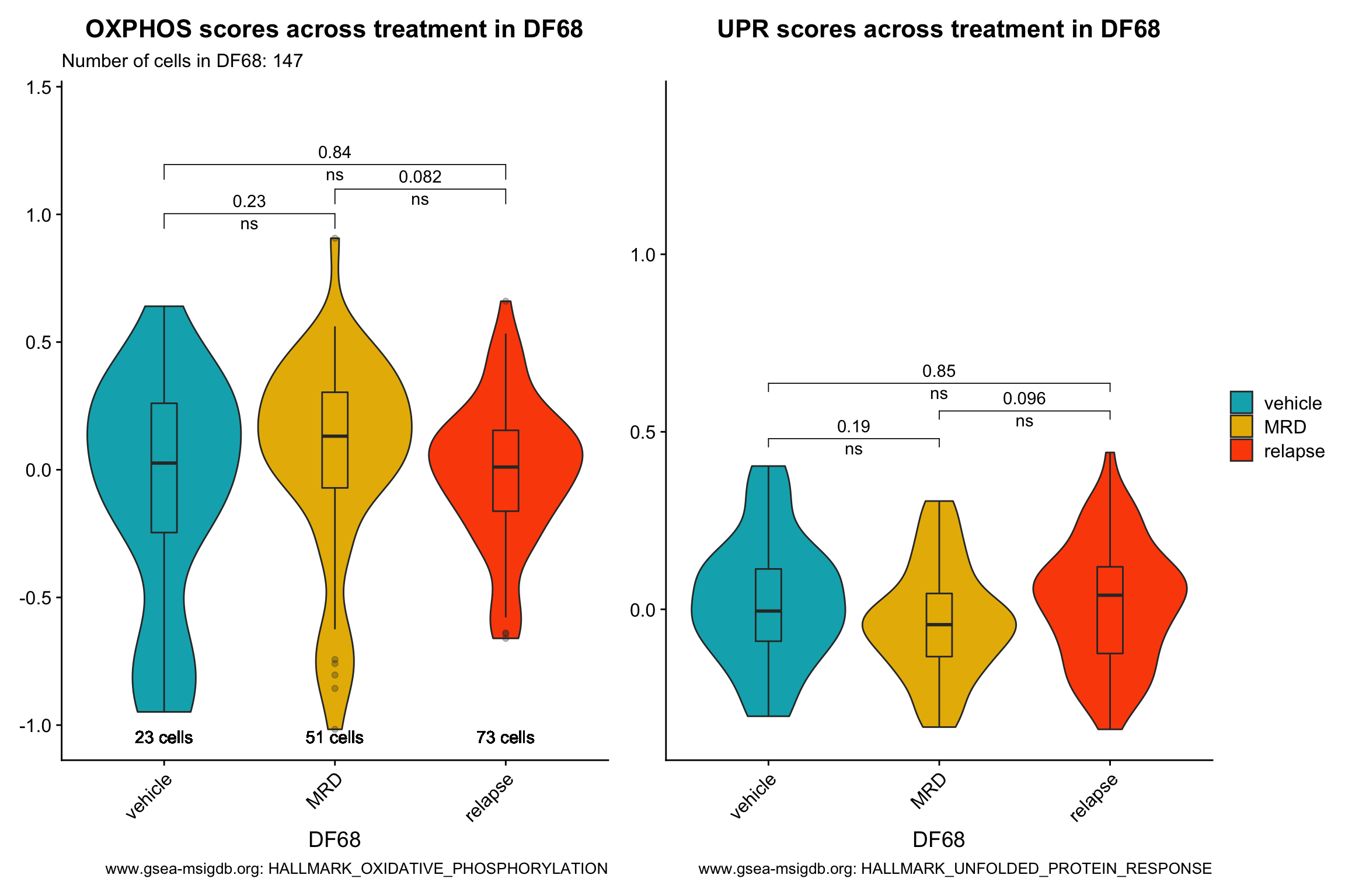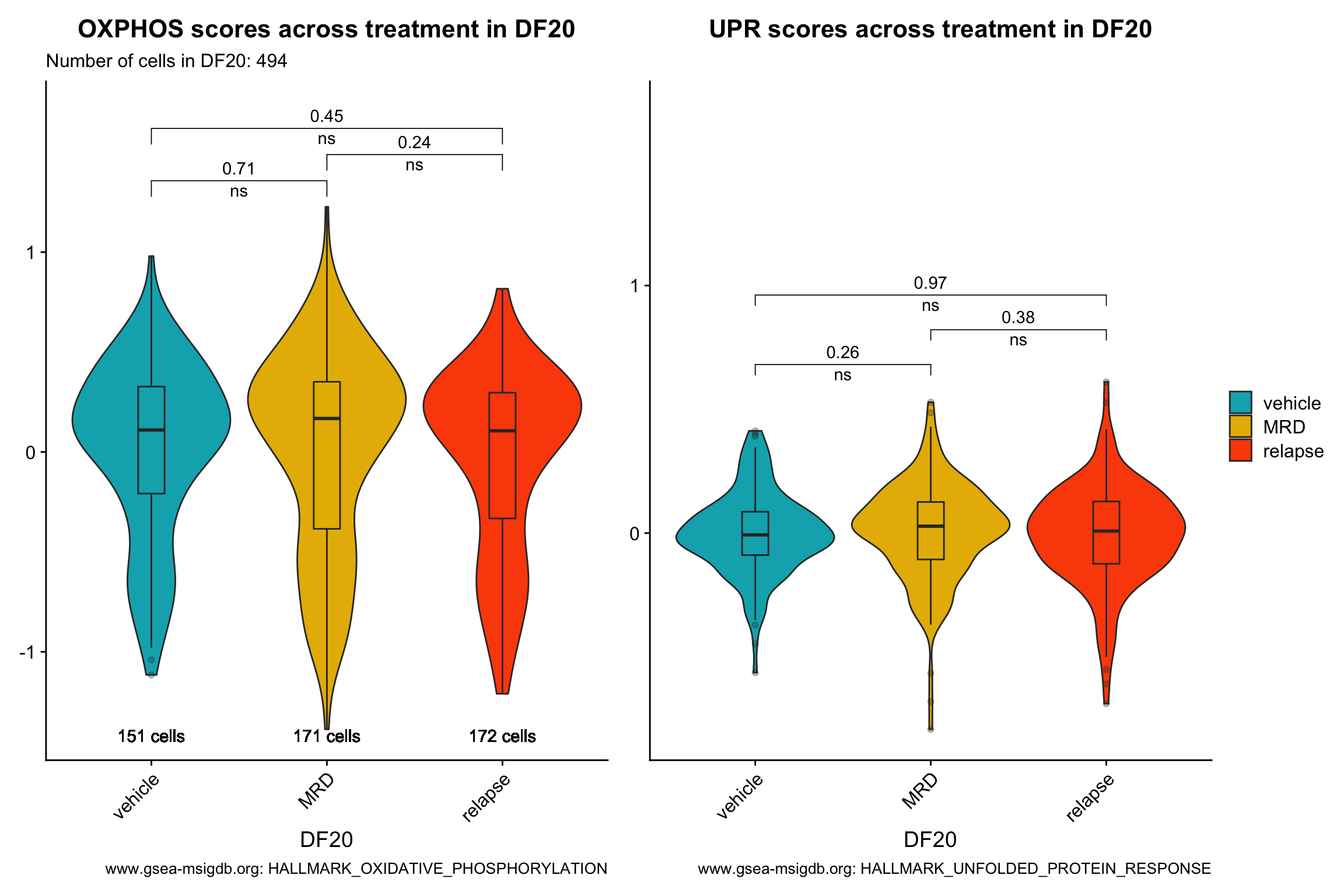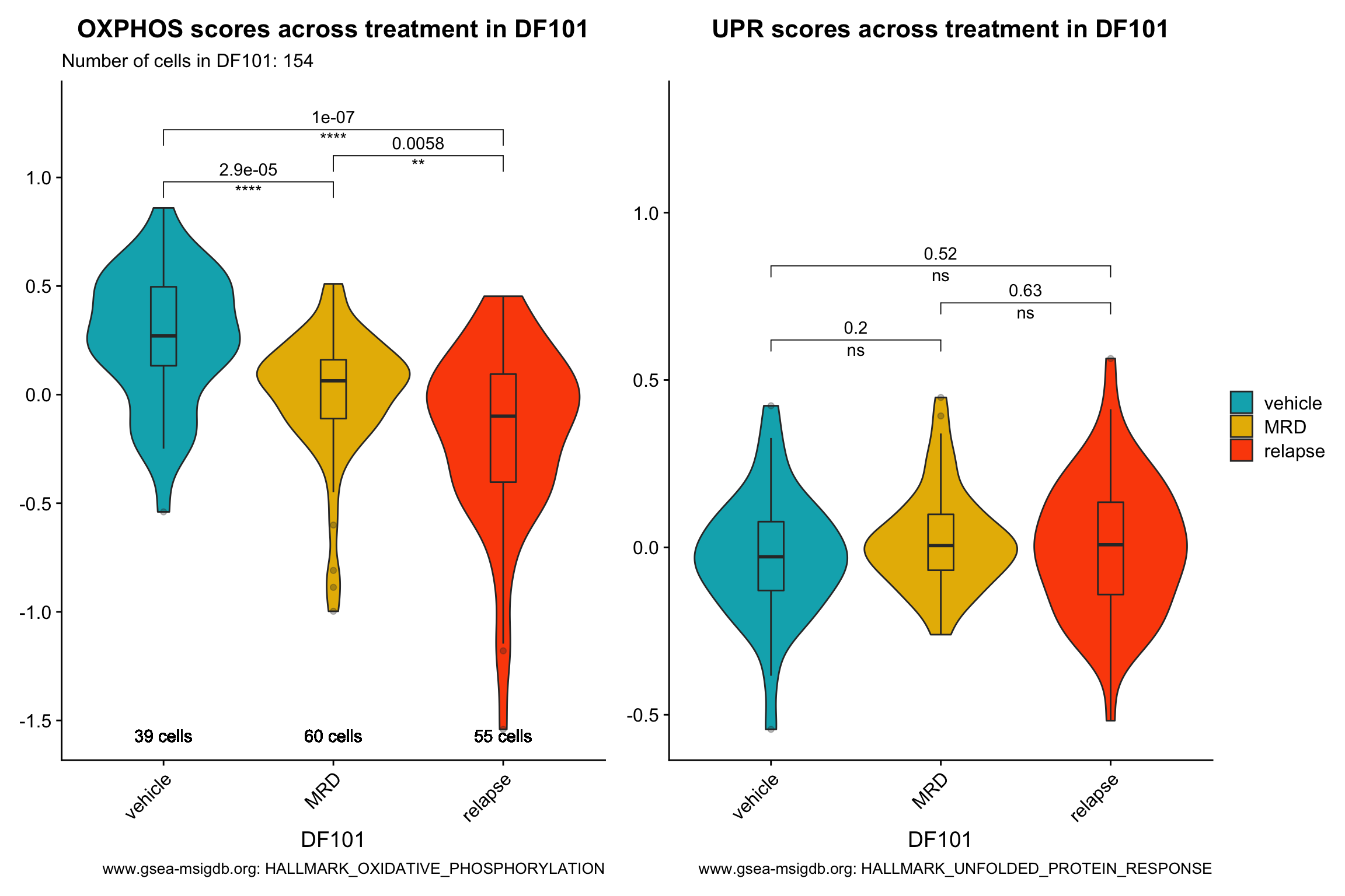 p[[2]] <- p[[2]] + labs(title = glue("UPR scores across treatment in {obj}"), x = obj, caption = "www.gsea-msigdb.org: HALLMARK_UNFOLDED_PROTEIN_RESPONSE") +