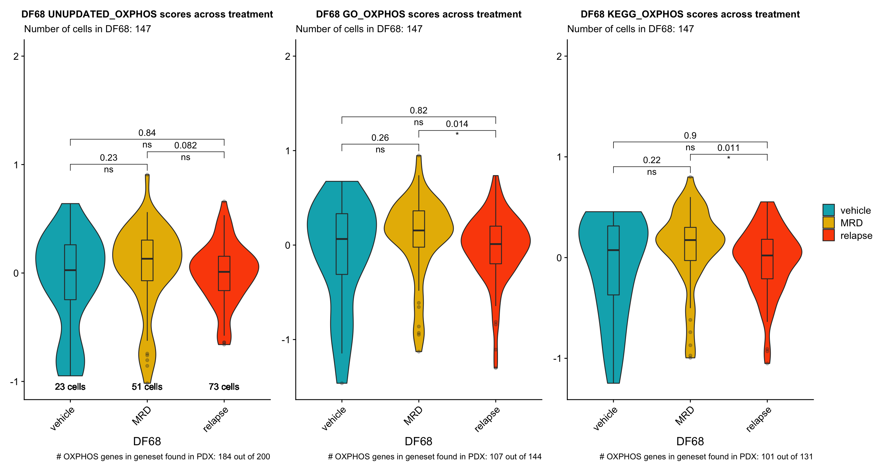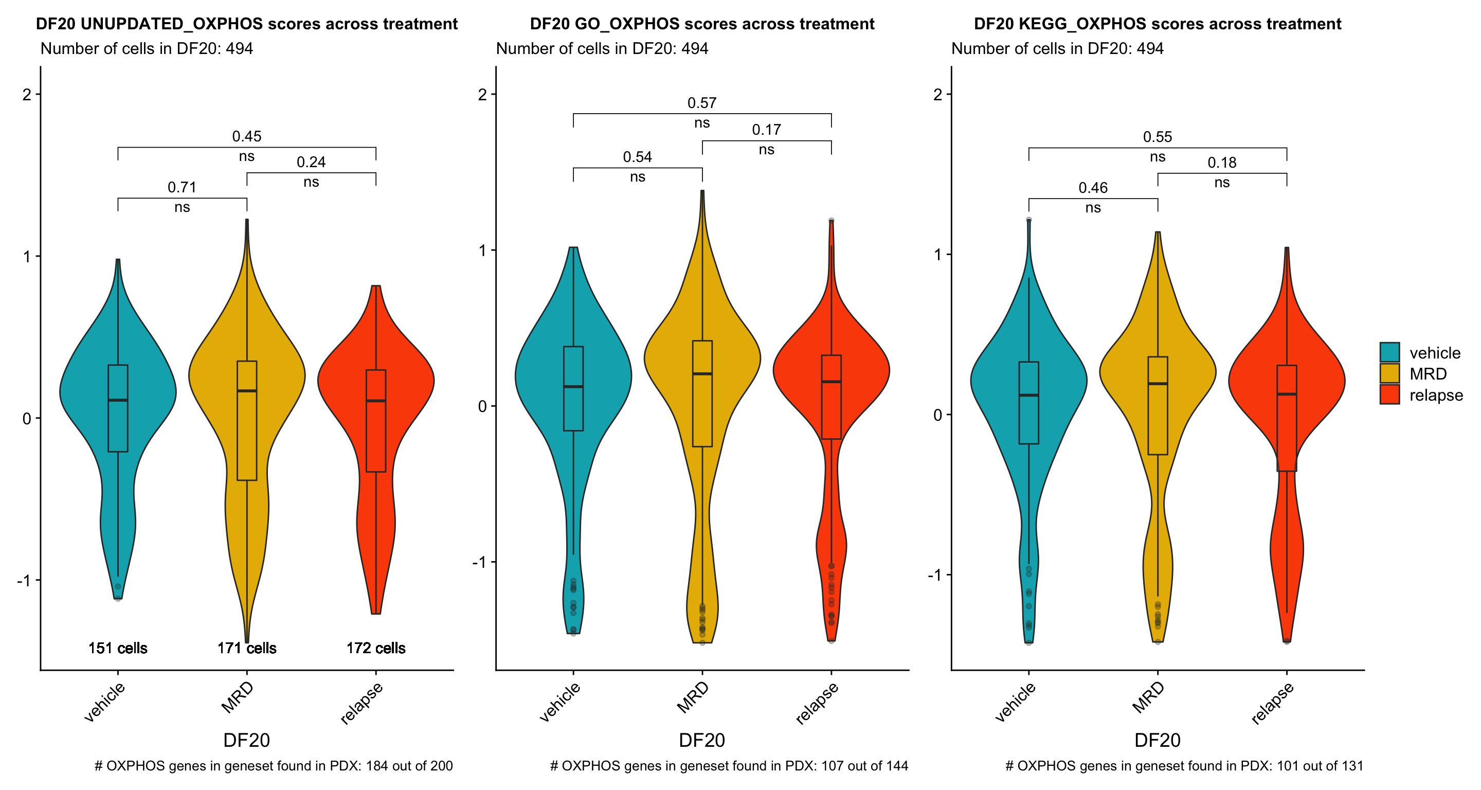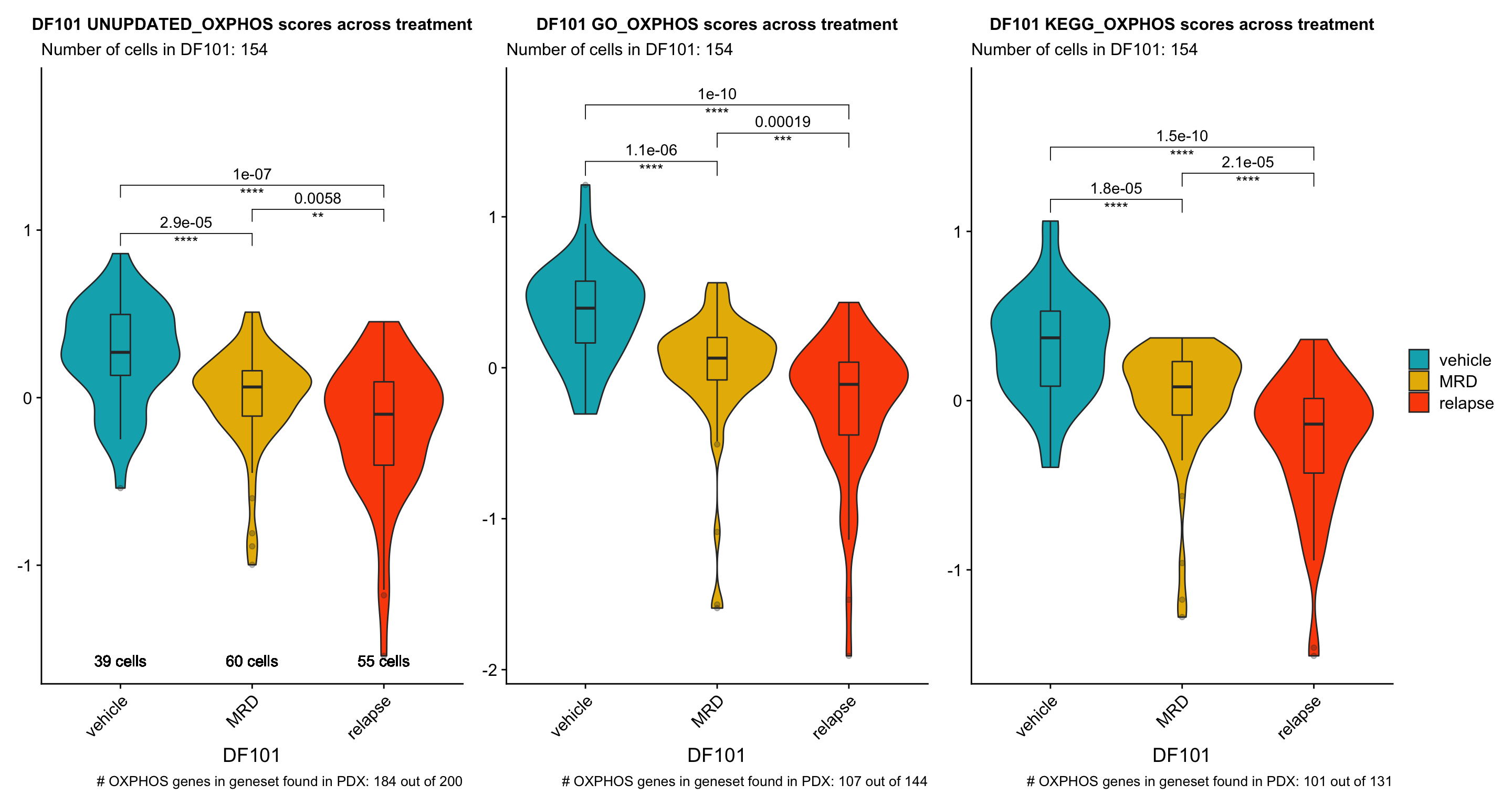 p[[3]] <- p[[3]] + labs(title = glue("{name} KEGG_OXPHOS scores across treatment"), x = name, subtitle = glue("Number of cells in {name}: {numCells}"), caption = paste("# OXPHOS genes in geneset found in PDX:", sum(hallmark.list[["KEGG.OXPHOS"]] %in% rownames(obj)), "out of", length(hallmark.list[["KEGG.OXPHOS"]]))) +