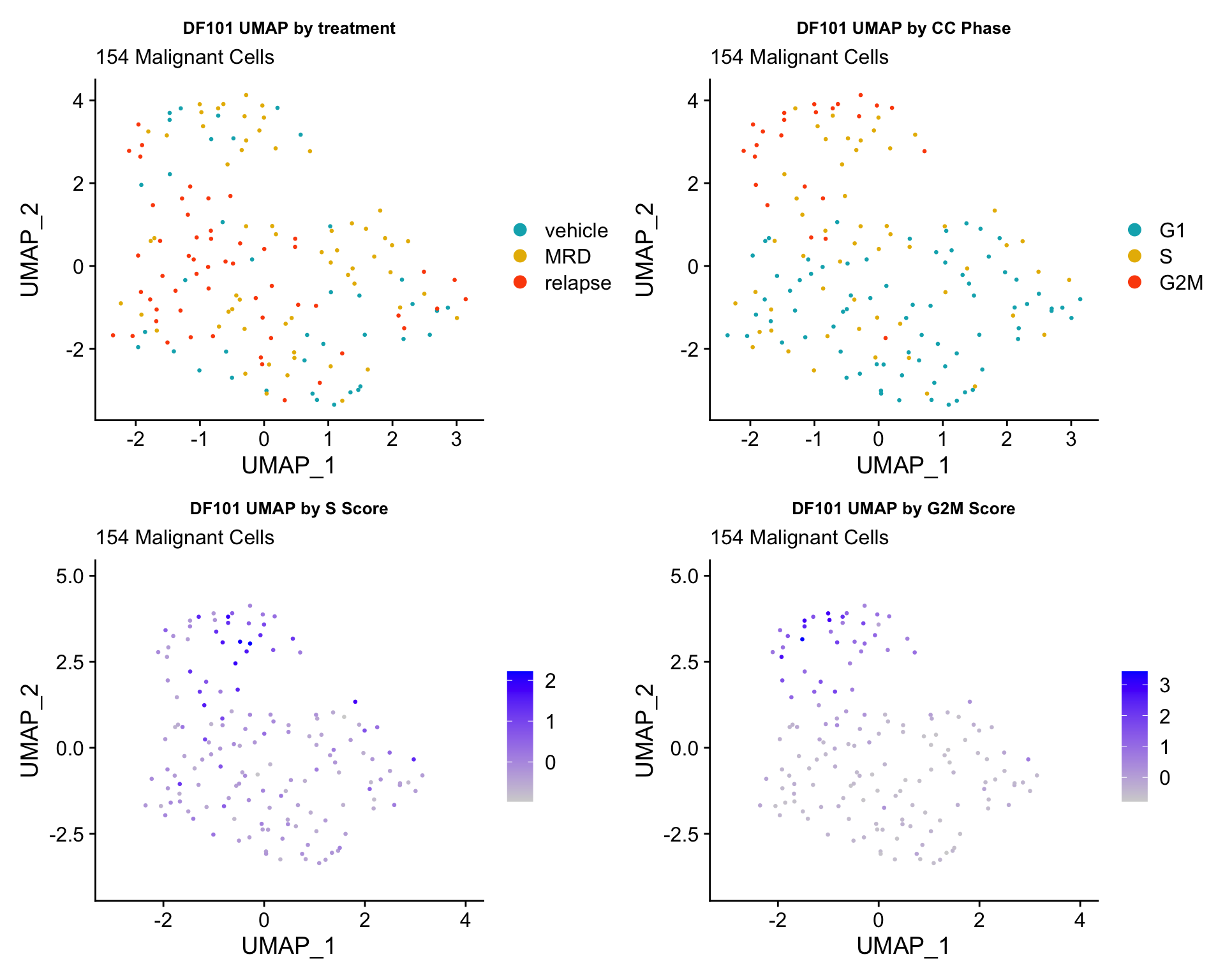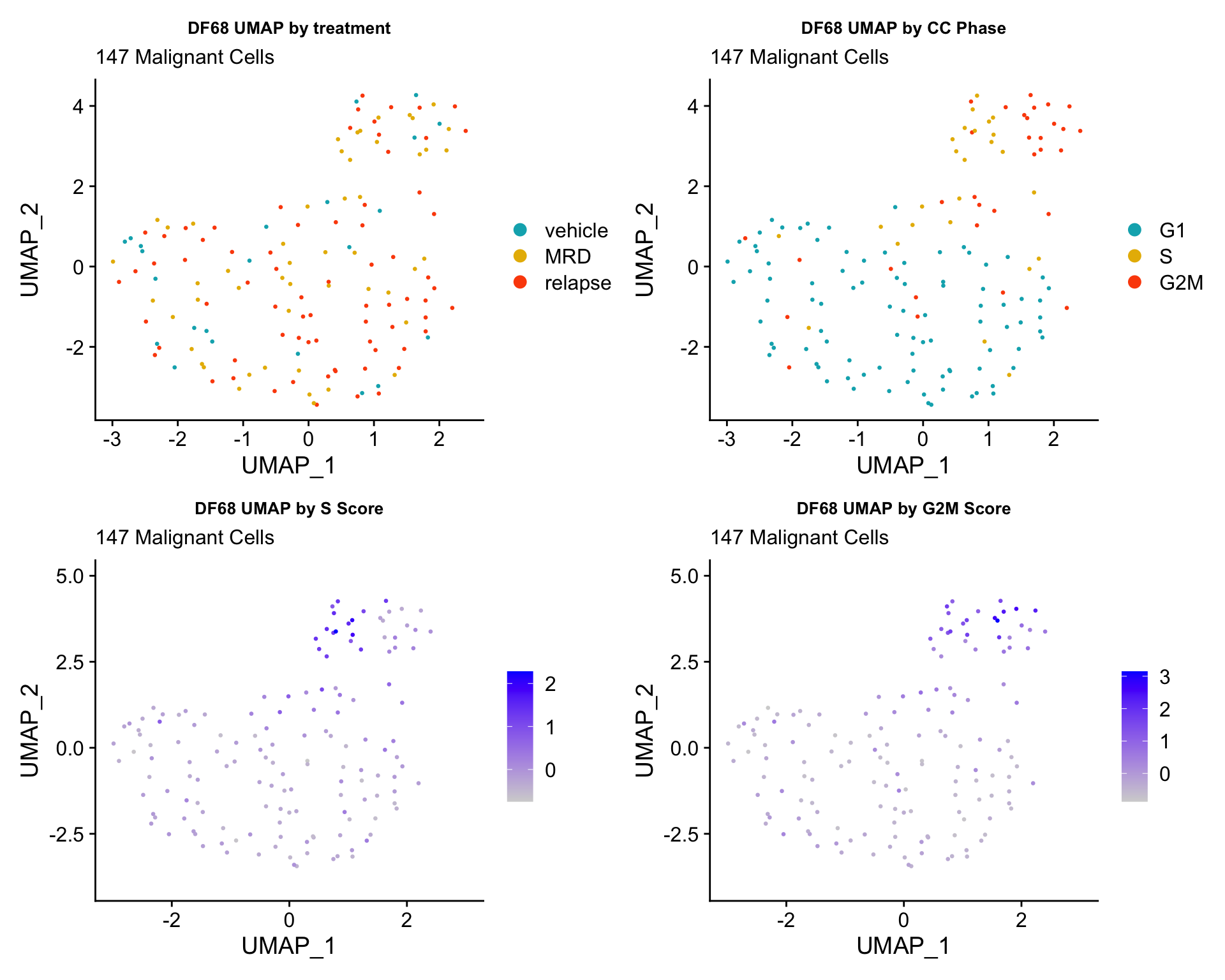 byscore[[2]] <- byscore[[2]] + labs(title = glue("{name} UMAP by G2M Score"), subtitle = glue("{numCells} Malignant Cells")) + theme(plot.title = element_text(size = 10))