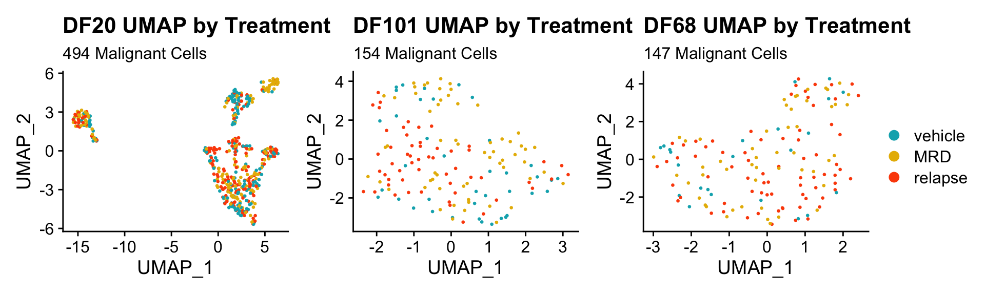 labs(title = glue("{name} UMAP by treatment"), subtitle = glue("{numCells} Malignant Cells")) +