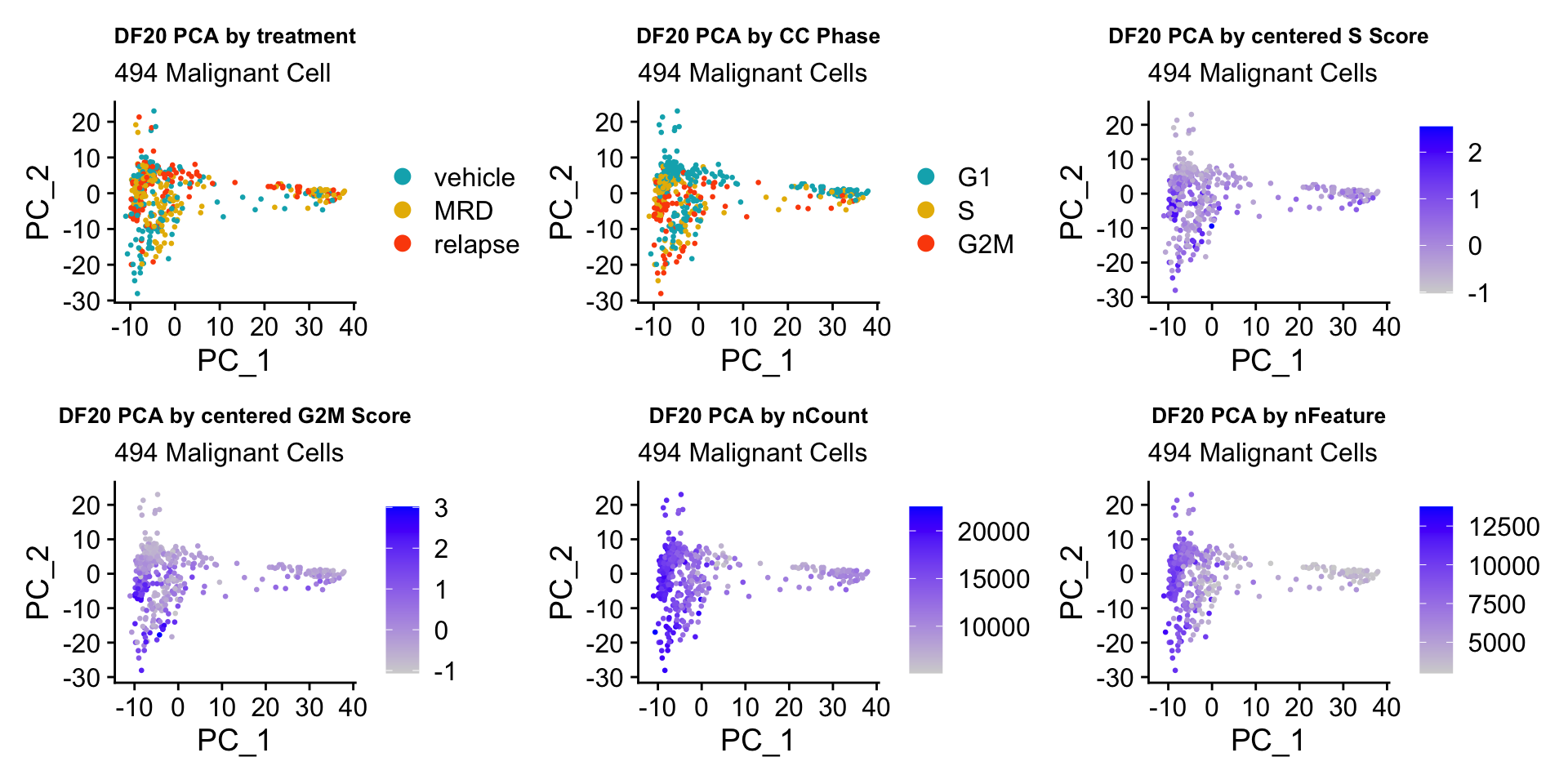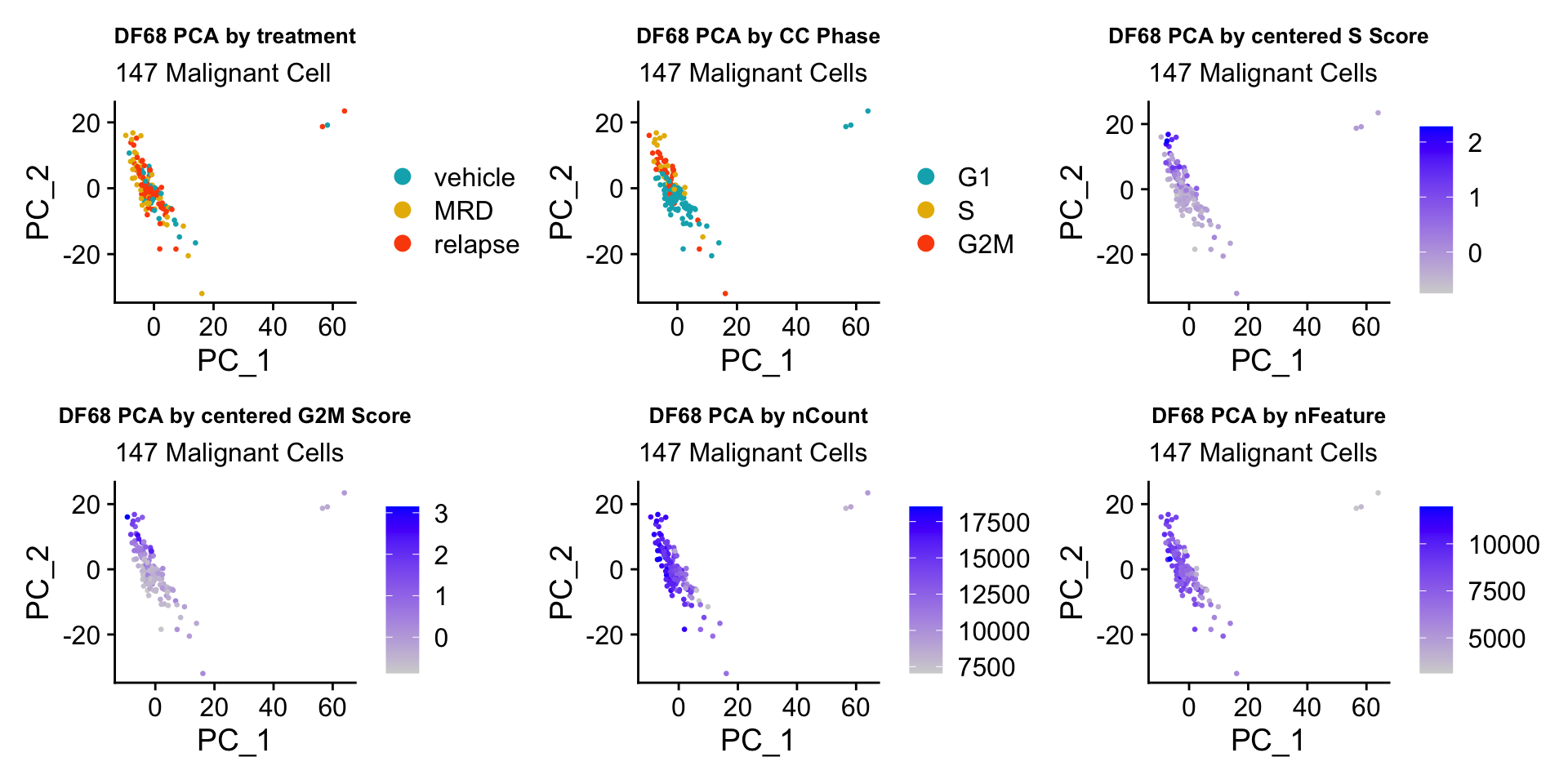 byscore[[2]] <- byscore[[2]] + labs(title = glue("{name} PCA by centered G2M Score"), subtitle = glue("{numCells} Malignant Cells")) + theme(plot.title = element_text(size = 10))