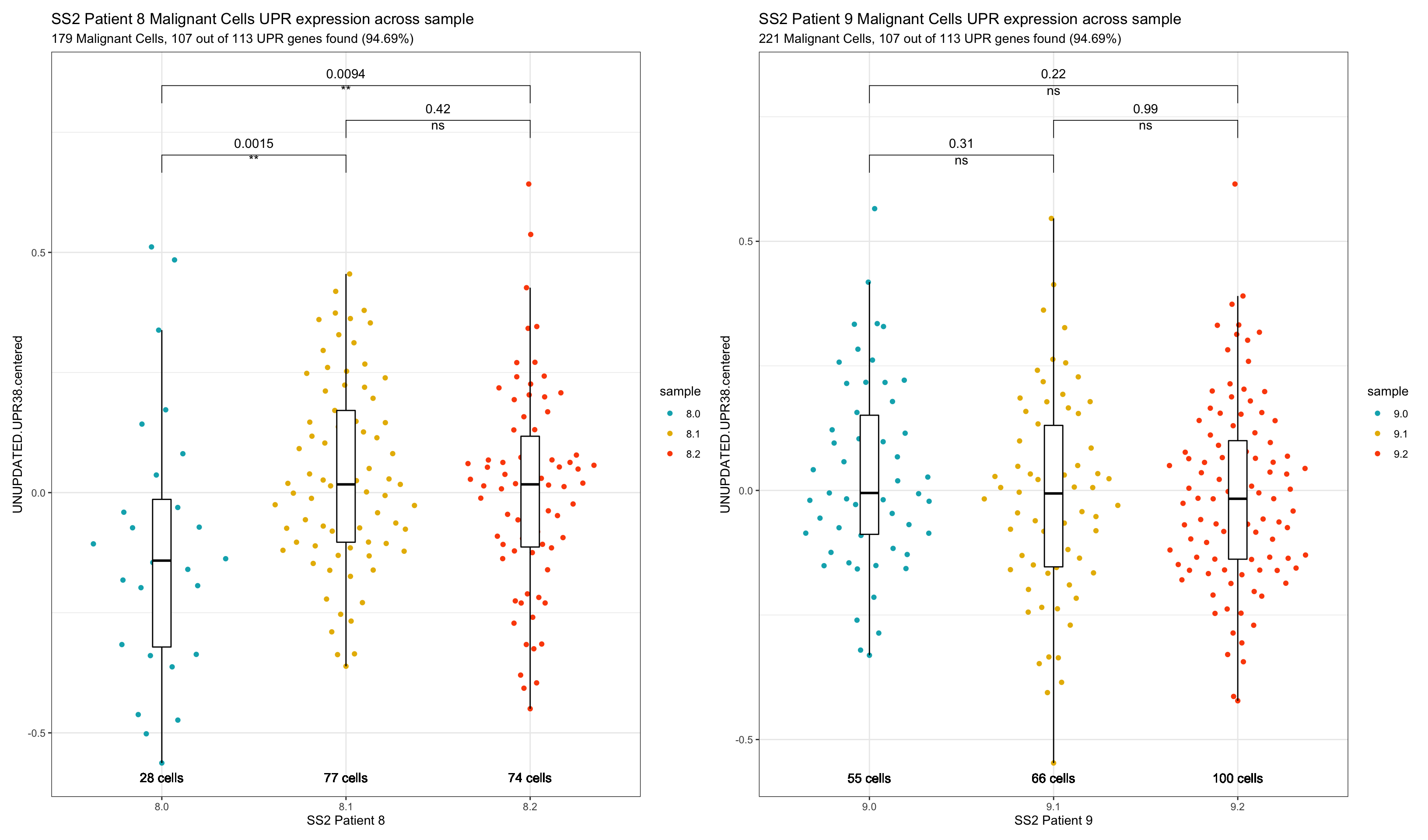 p8.UPR.plots[[name]] <- DEAnalysis_code(SS2Malignant.8, markers = marker, group.by = "sample", group.1 = group.1, group.2 = group.2, geneset = hallmark.list[["UNUPDATED.UPR"]]) + labs(title = paste(group.1, "vs", group.2, "DE UPR Genes"))