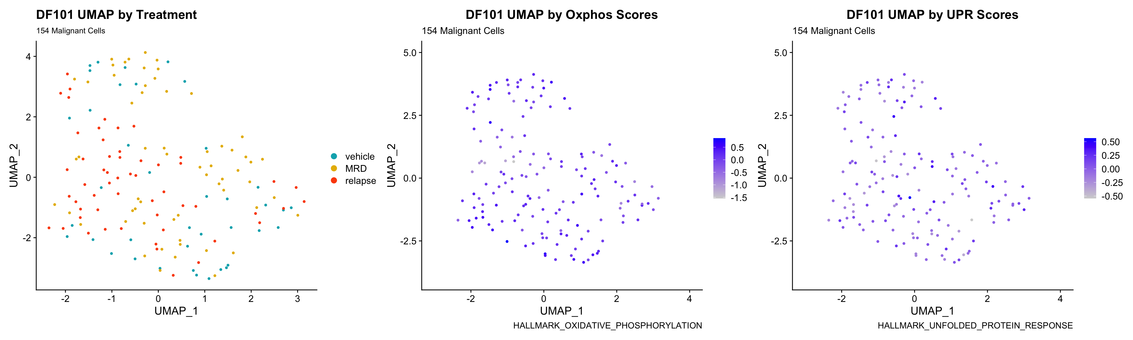 p[[2]] <- p[[2]] + labs(title = glue("{obj} UMAP by UPR Scores"), subtitle = glue("{numCells} Malignant Cells"), caption = "HALLMARK_UNFOLDED_PROTEIN_RESPONSE")