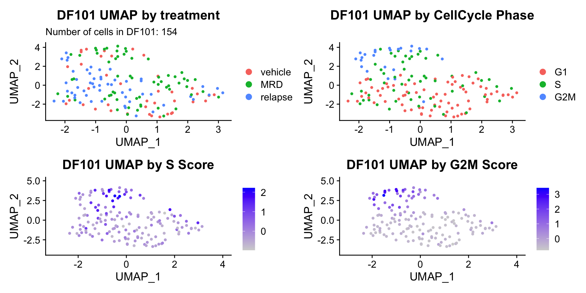 byscore[[2]] <- byscore[[2]] + labs(title = glue("{name} UMAP by G2M Score"))
