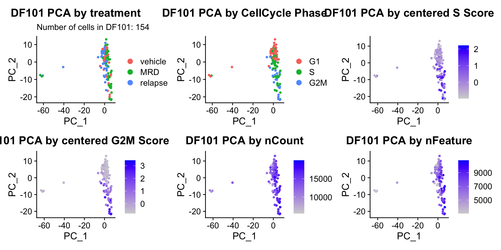 DF101.pca.byt <- PCAPlot(PDX_DF101, group.by ="treatment.status") + labs(title = "DF101 PCA by Treatment", subtitle = paste("Number of Cells:", nrow(PDX_DF20@meta.data)))