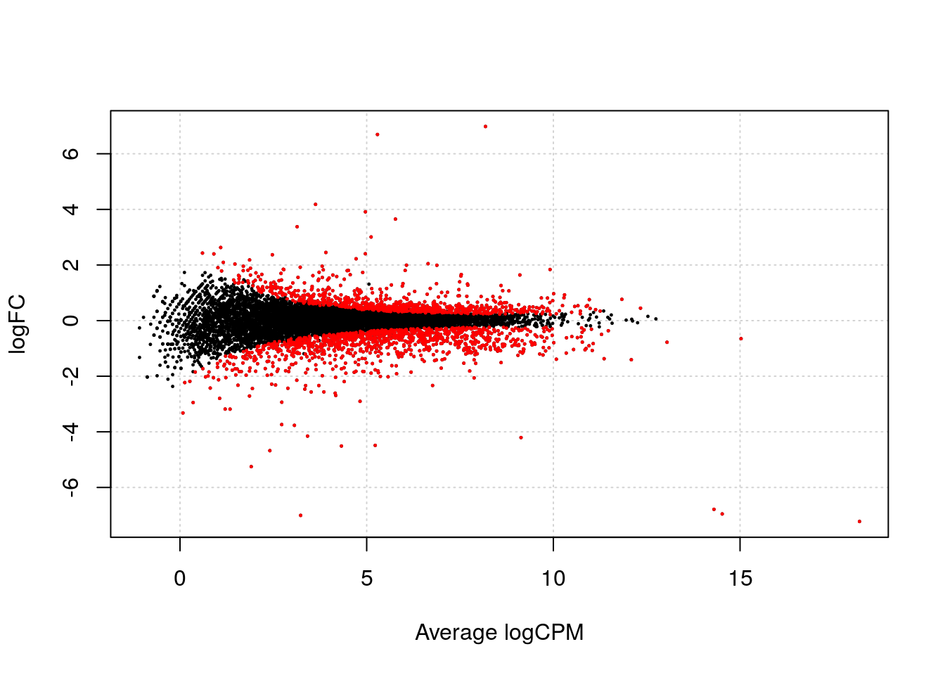 plotSmear(dgeTest, de.tags = rownames(topTags$table)[which(topTags$table$FDR<0.01)],)