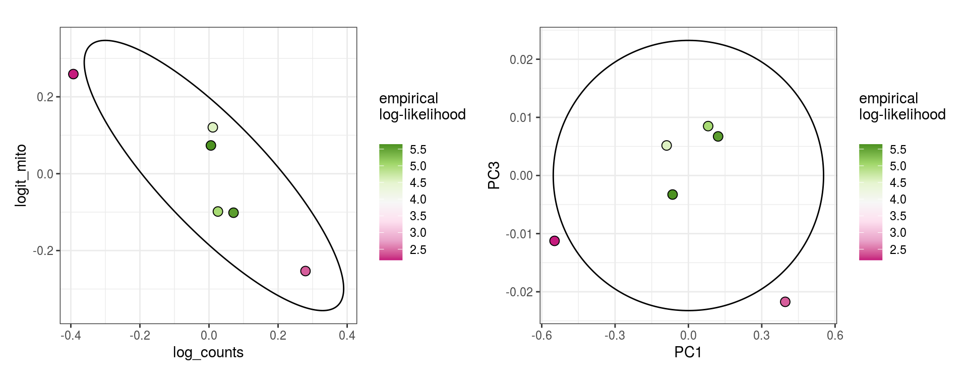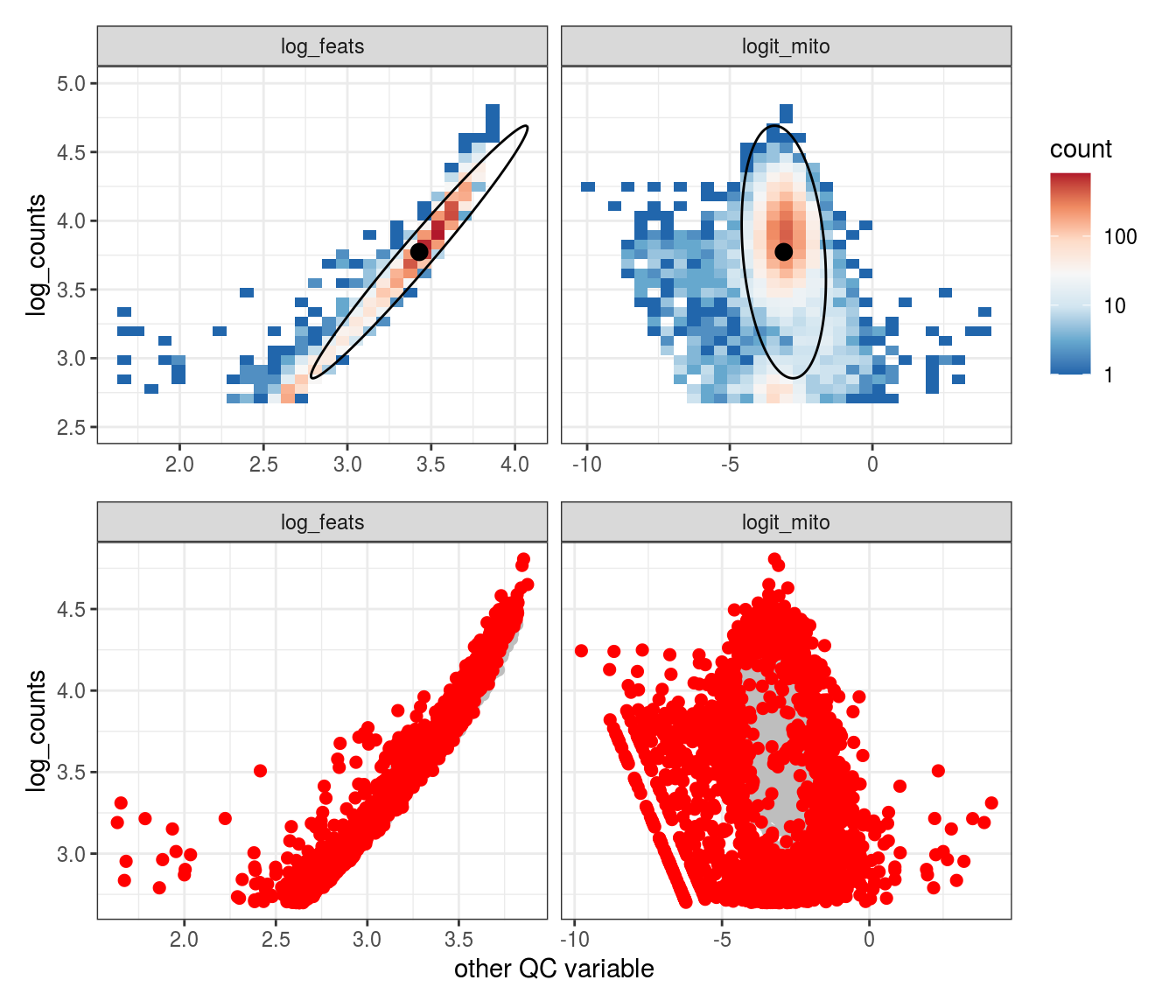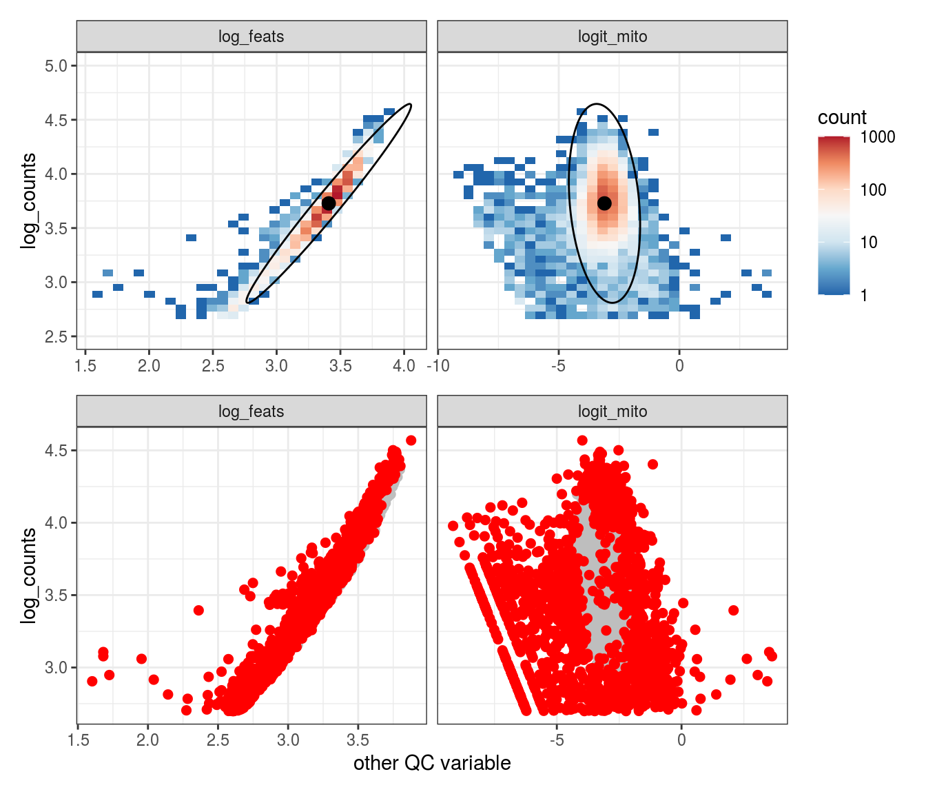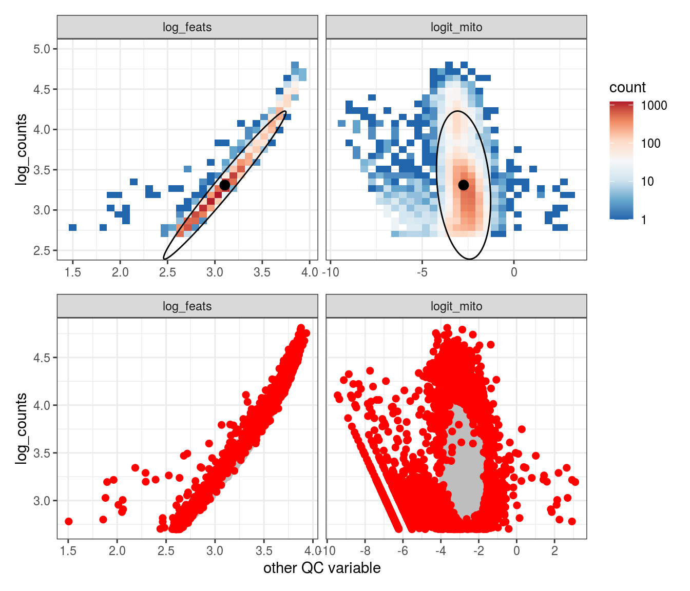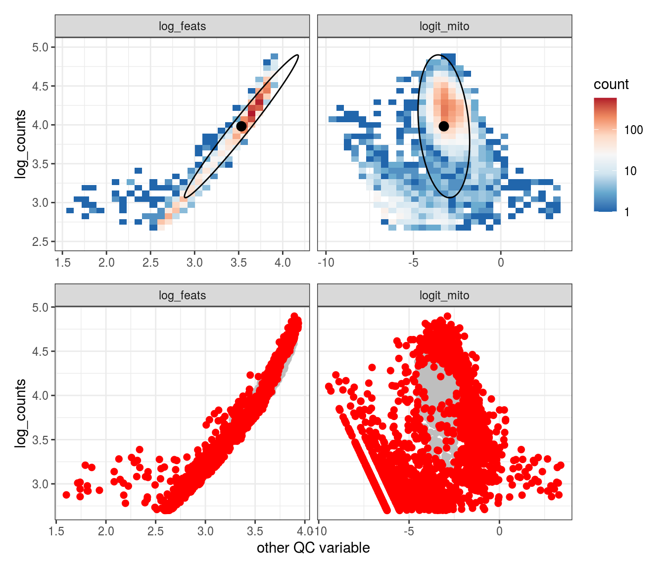SampleQC model fits and outliers over QC biaxialsThese plots show biaxial distributions of each sample, annotated with both the fitted mean and covariance matrices, and the cells which are then identified as outliers. You can use this to check that you have the correct number of components for each sample grouping, and to check that the fitting procedure has worked properly. The means and covariances of the components should match up to the densest parts of the biaxial plots.