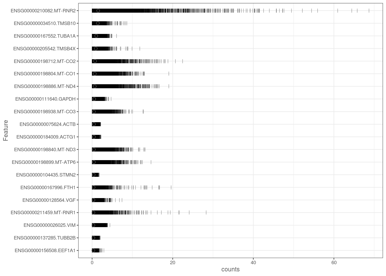 We plot the top 20 genes with highest expression. Mitochondrial genes, actin, ribosomal proteins or MALAT1 are examples of genes that are expected to have very high expression.
