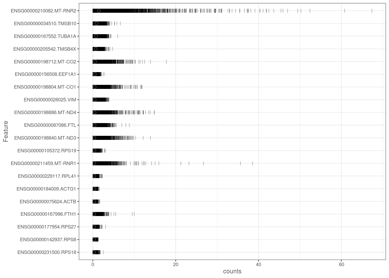 We plot the top 20 genes with highest expression. Mitochondrial genes, actin, ribosomal proteins or MALAT1 are examples of genes that are expected to have very high expression.