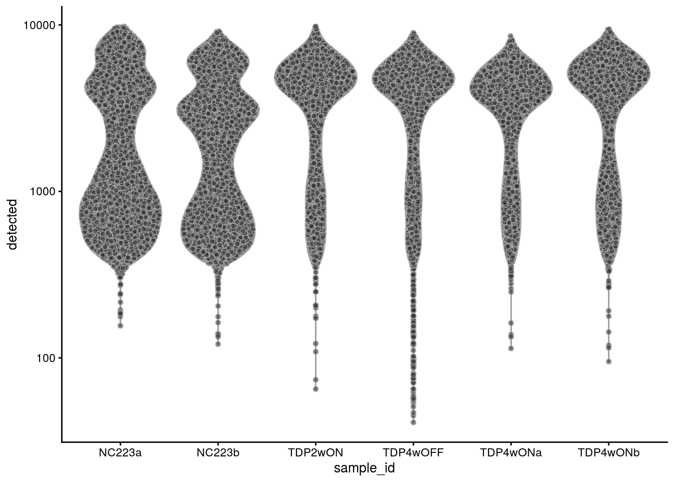 plotColData(sce, x = "sample_id", y = "detected") + scale_y_log10()