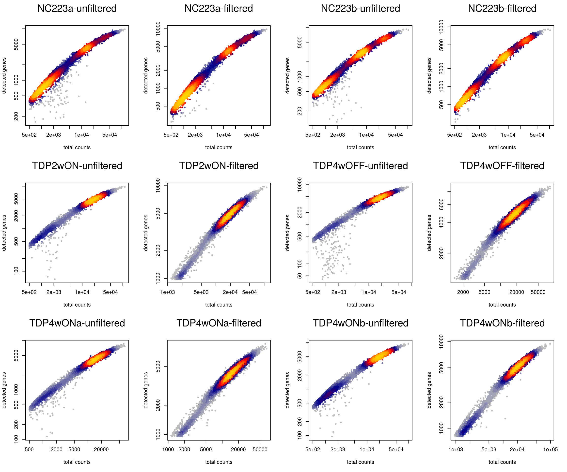 log = "xy", main = paste0(i, "-filtered"), xlab = "total counts",