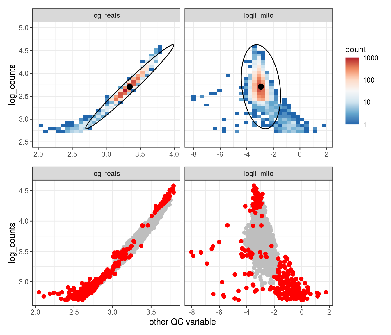 SampleQC model fits and outliers over QC biaxialsThese plots show biaxial distributions of each sample, annotated with both the fitted mean and covariance matrices, and the cells which are then identified as outliers. You can use this to check that you have the correct number of components for each sample grouping, and to check that the fitting procedure has worked properly. The means and covariances of the components should match up to the densest parts of the biaxial plots.