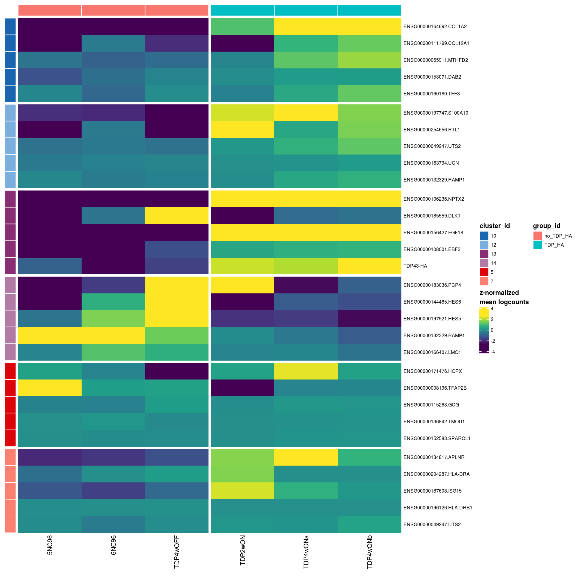 pbHeatmap(sce, res2, k = c("5", "7", "10", "12", "13", "14"), top_n = 5)