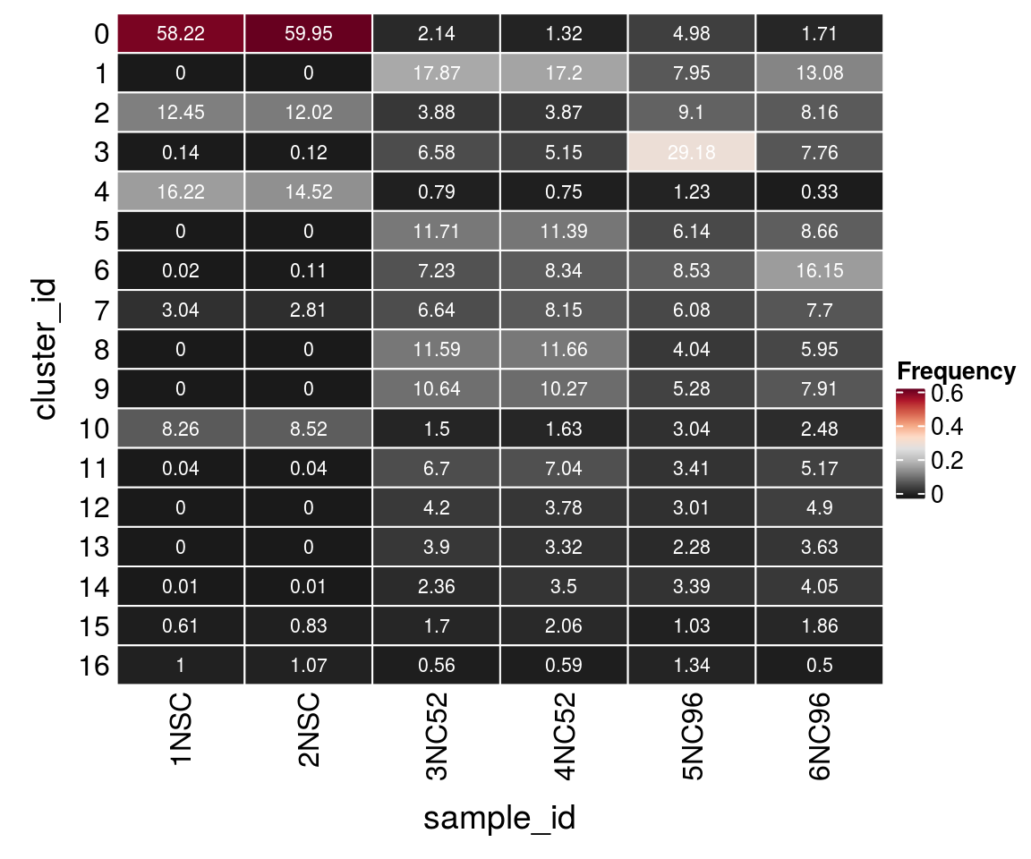 (n_cells <- table(sce$cluster_id, sce$sample_id))