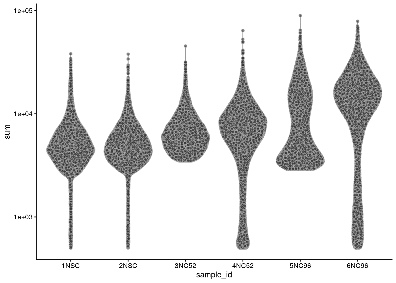 plotColData(sce, x = "sample_id", y = "sum") + scale_y_log10()