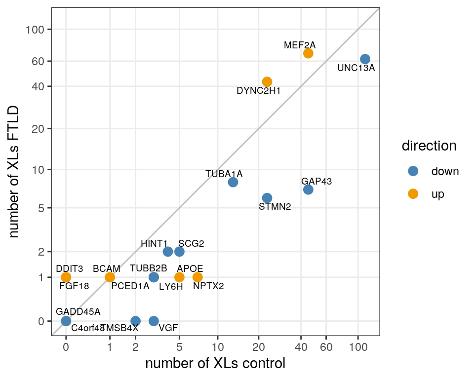 ggplot(df, aes(x = control + 1, y = FTLD + 1, color = direction, label = gene)) +