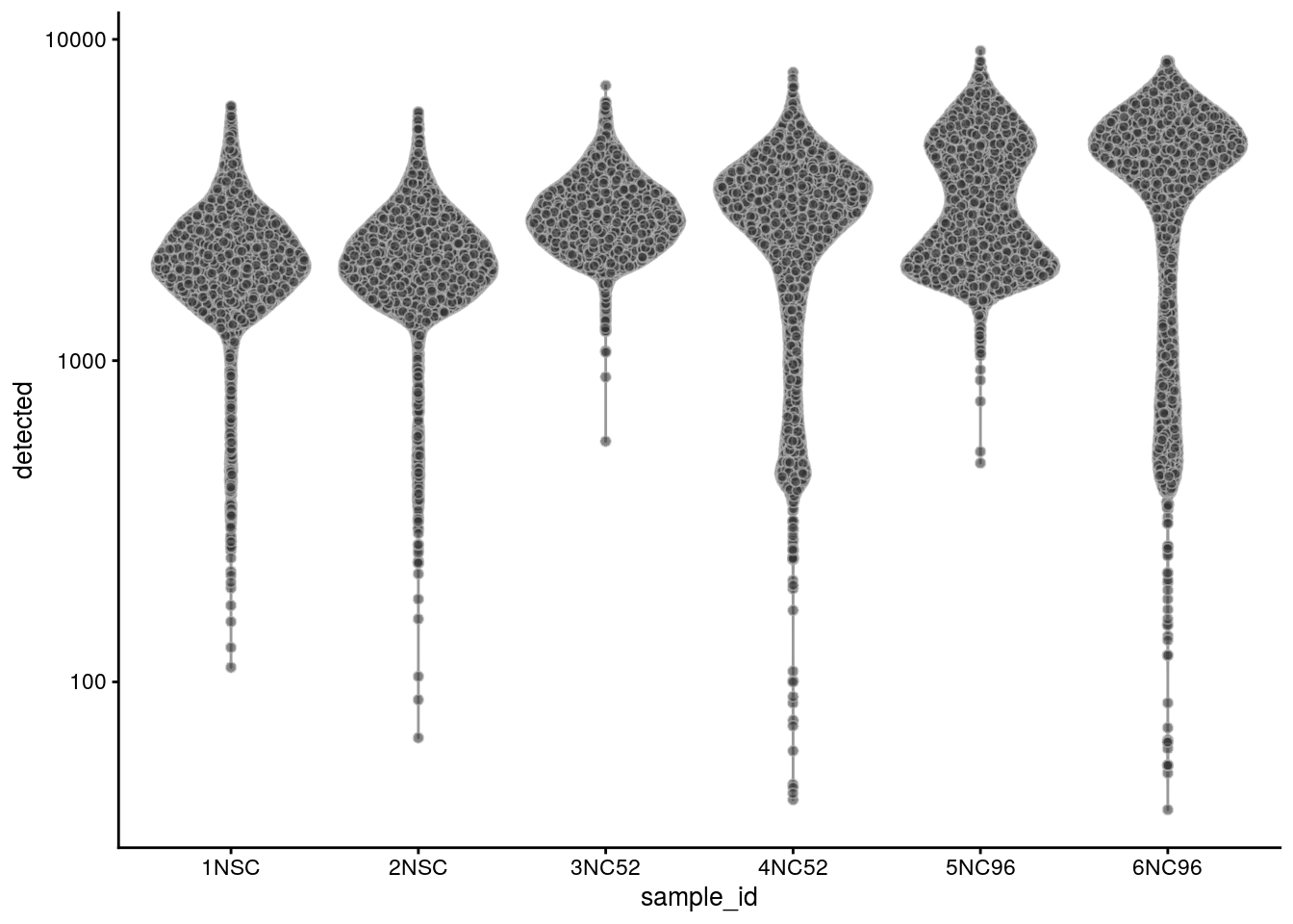 plotColData(sce, x = "sample_id", y = "detected") + scale_y_log10()