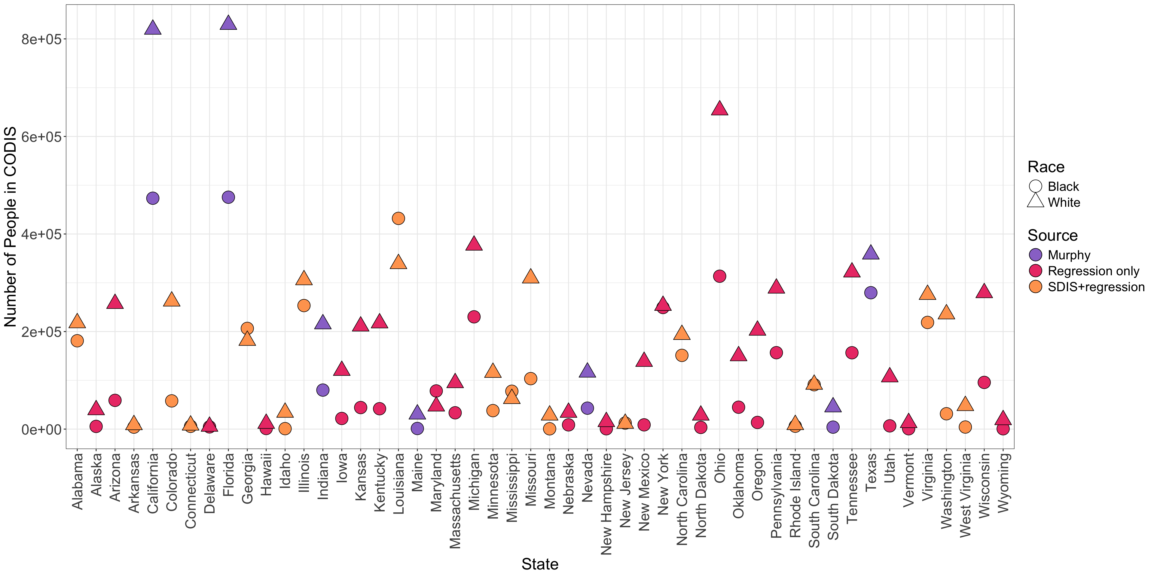 Using the above regression models, we make predictions of the number of Black and White people in CODIS by state. The plot below shows our estimates for each state, colored by the data source used for each state. The number of Black people in the database are indicated with circles and the number of White people is indicated by triangles.