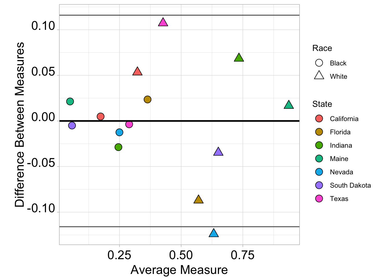 While none of the coefficients were significant in the regression, our model had an \(R^2\) value of 0.93, demonstrating a good fit. The following plot showing the estimated racial composition using the regression model vs. the true values for the states with available data. We also plot a difference plot (also known as a Bland-Altman plot).