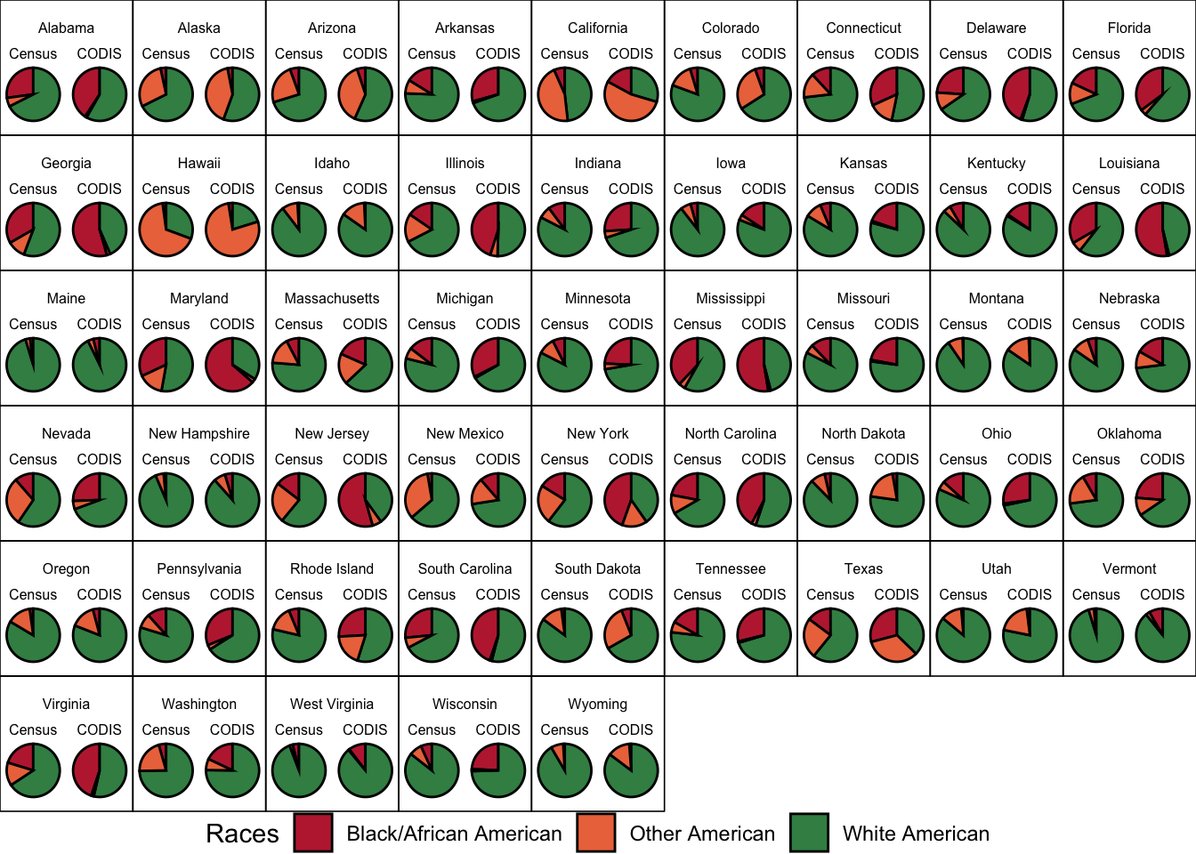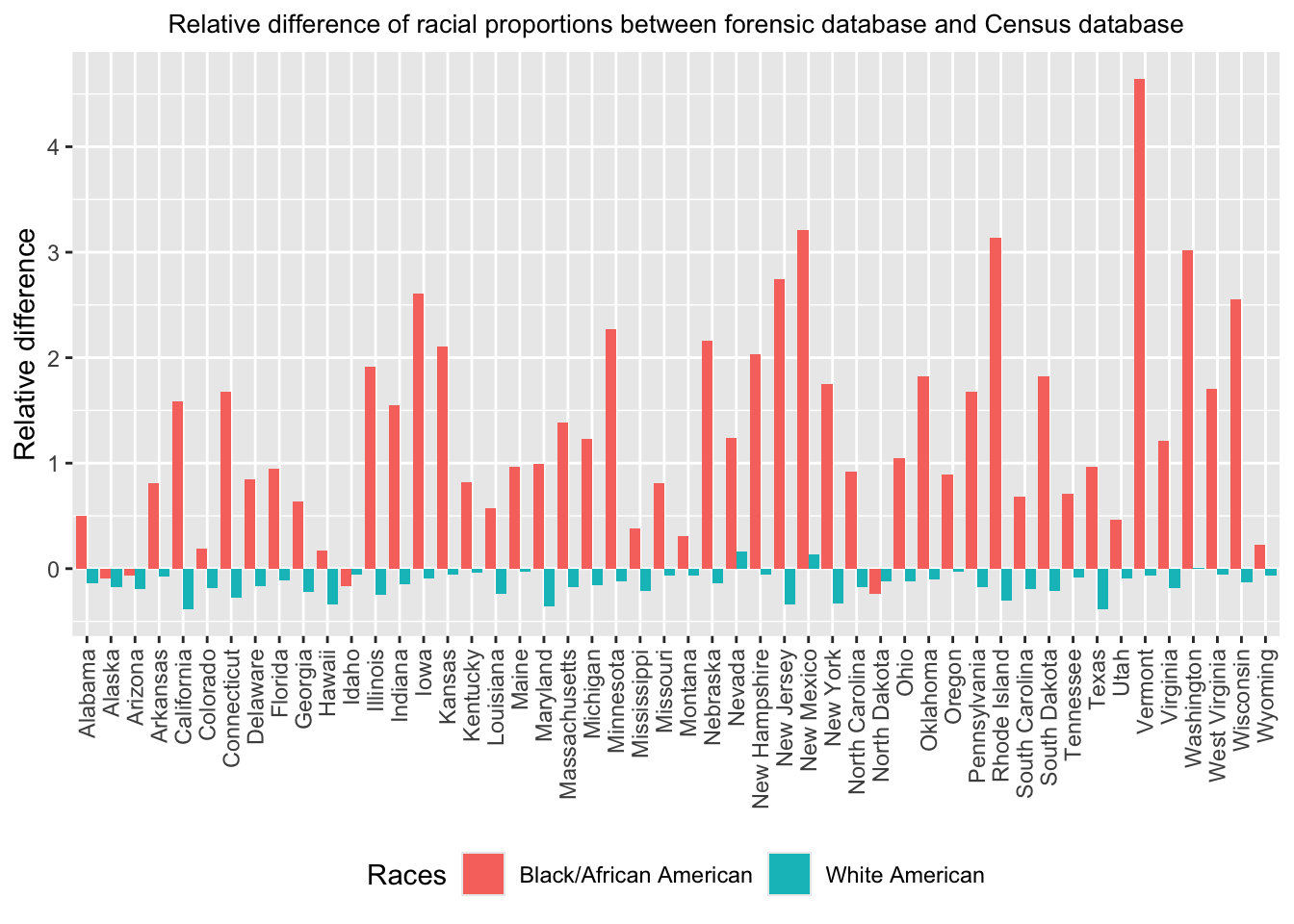 relative~difference=\frac{Proportion_{CODIS}-Proportion_{Census}}{Proportion_{Census}}.