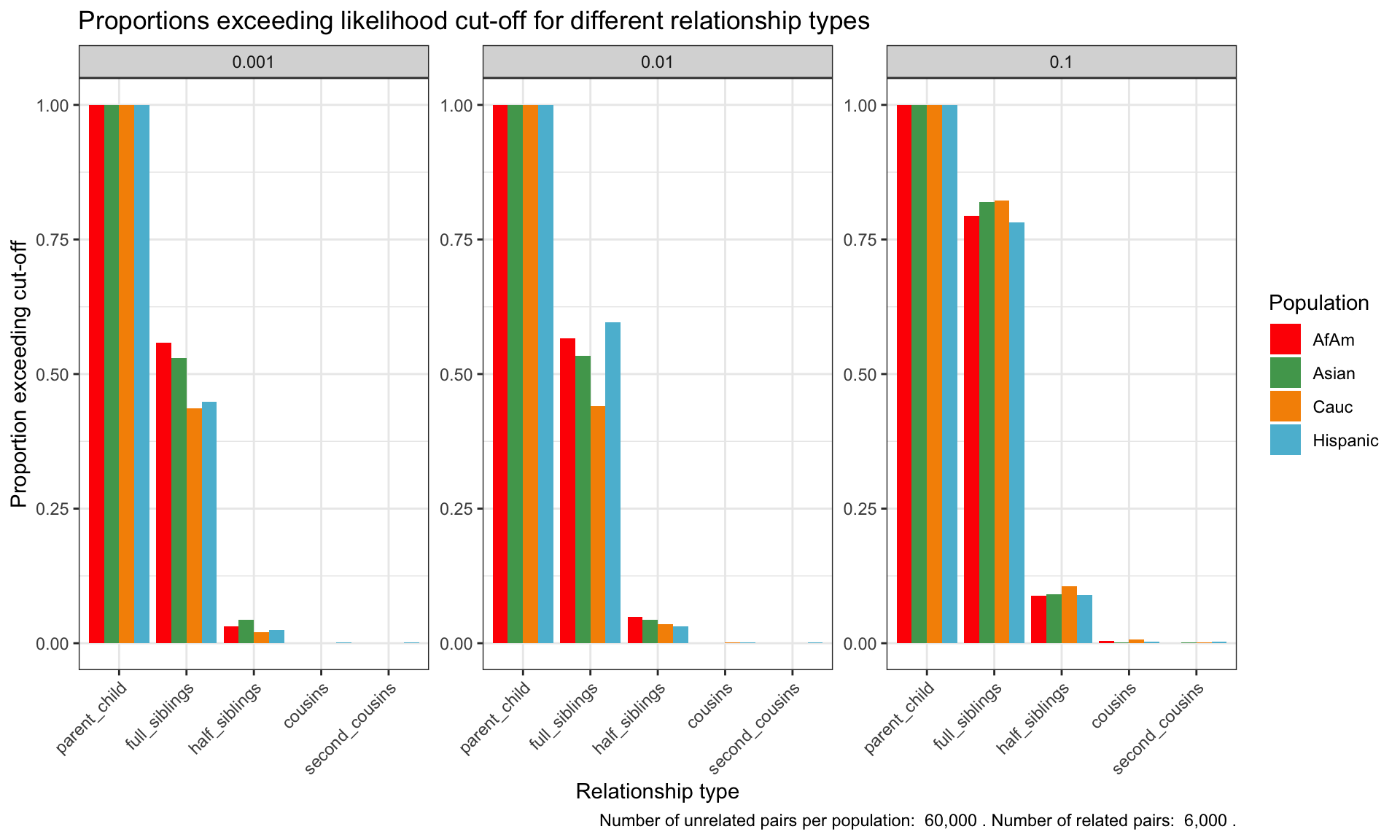 We will simulate pairs of individuals with known relationships (e.g., parent-child, siblings), including unrelated individuals, based on the specified parameters. We will then calculate the likelihood ratio for each pair of individuals based on the simulated genotypes and known relationships.