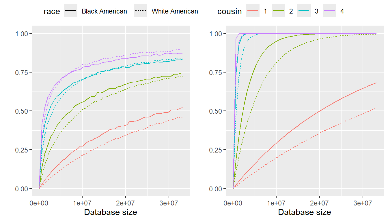We focus on long-range familial search in the United States, using the U.S. Census population as the total population size, given as \(N=331,449,281\). The racial composition is \[\alpha_{black}=12.05021\%,~\alpha_{white}=57.83619\%,~\alpha_{other}=30.1136\%,\] where \(\alpha_i\) indicates the proportion of race \(i\) in the population.