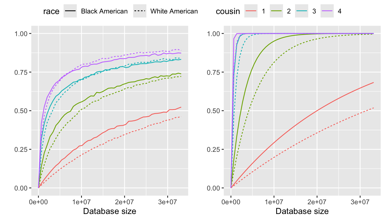 We focus on long-range familial search in the United States, using the U.S. Census population as the total population size, given as \(N=331,449,281\). The racial composition is \[\alpha_{black}=12.05021\%,~\alpha_{white}=57.83619\%,~\alpha_{other}=30.1136\%,\] where \(\alpha_i\) indicates the proportion of race \(i\) in the population.