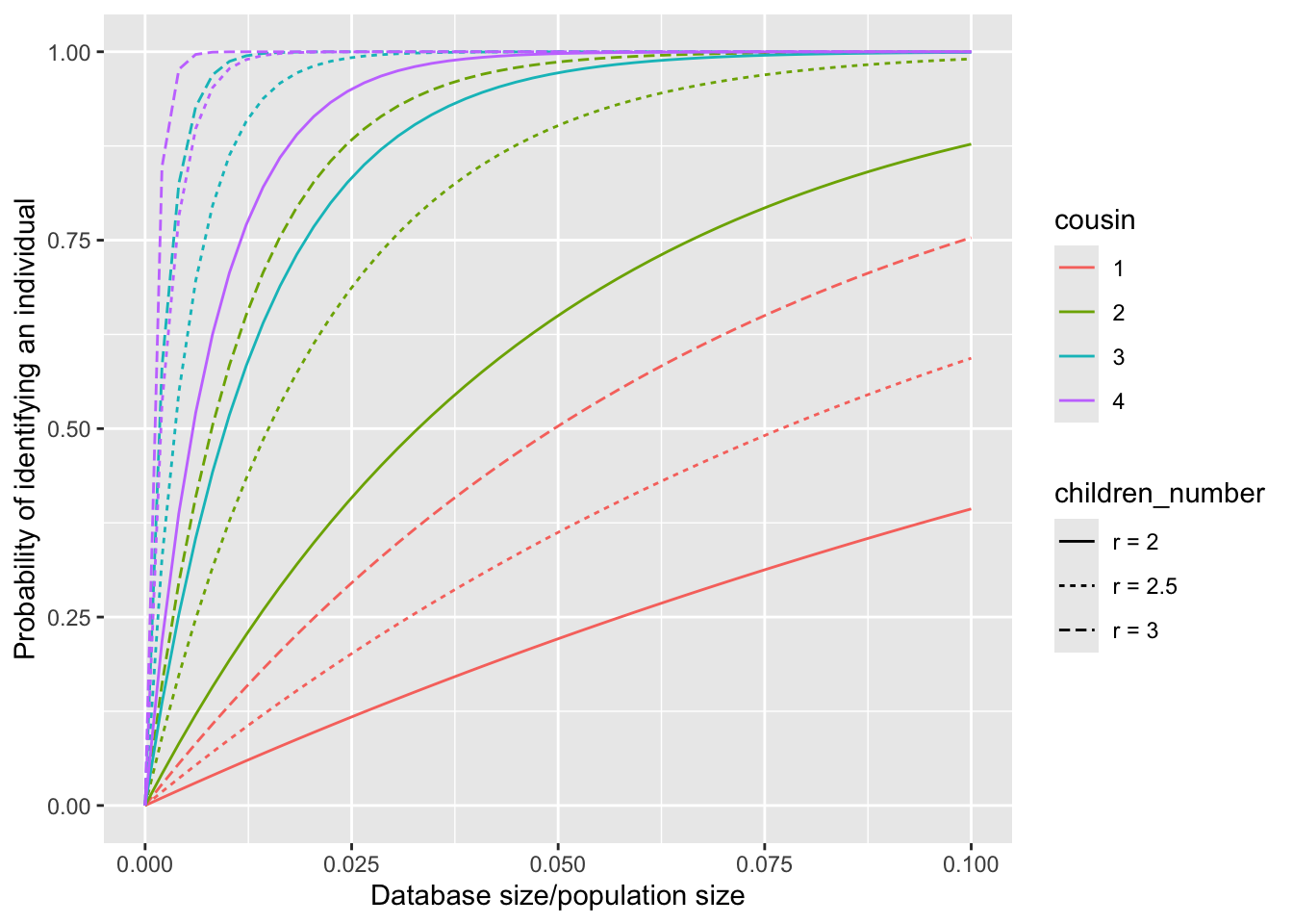 Additionally, since \(r\) is a random variable, we calculate \(P(\text{identify}|\bar{r})\) to make a comparison with \(E[P(\text{identify}|r)]\), where \(\bar{r}\) represents the mean number of children. This probability \(P(\text{identify}|\bar{r})\) is used in the paper of Erlich et al. 2018, if we substitute \(\bar{r}\) by a constant \(r\).