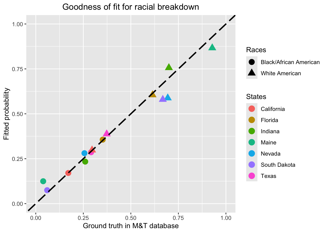 Furthermore, we plot the fitted racial proportions using stick-breaking binomial regression versus the ground truth for the 7 states with available data. This figure shows that data points are around the identical map, which means our model fits the training data well at least.
