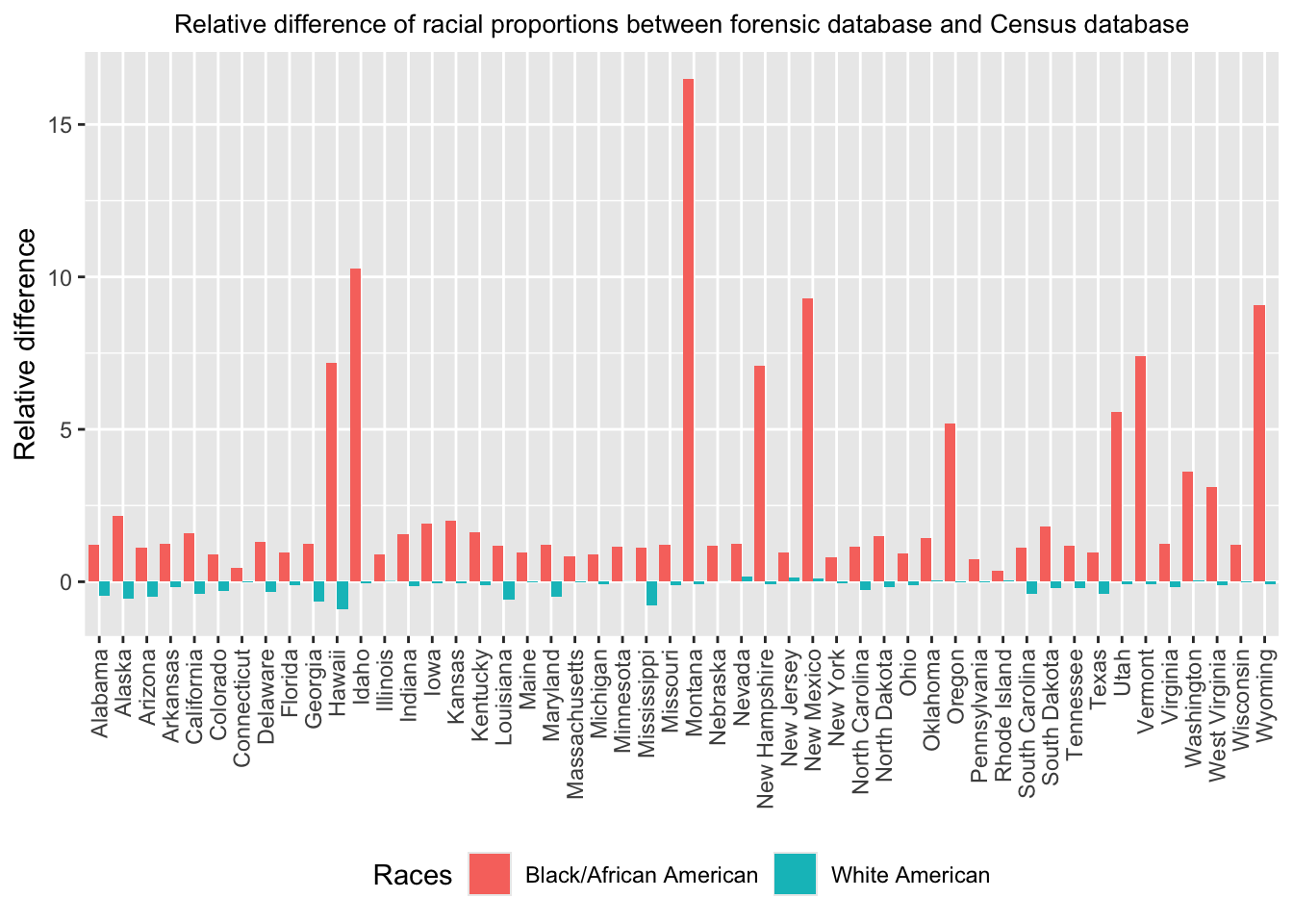 To compare racial proportions between CODIS and Census in each state, we visualize the absolute differences and relative differences of racial proportions. These differences are defined as followings, \[\begin{equation*} \begin{split} absolute~difference=Proportion_{CODIS}-Proportion_{Census},\\ relative~difference=\frac{Proportion_{CODIS}-Proportion_{Census}}{Proportion_{Census}}. \end{split} \end{equation*}\] The difference barcharts show that Black/African Americans are sigficantly overrepresented in all states and White Americans are underrepresented in most states in M&T forensic database compared to census representation.