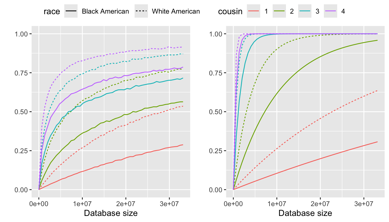 We focus on long-range familial search in the United States, using the U.S. Census population as the total population size, given as \(N=331,449,281\). The racial composition is \[\alpha_{black}=12.05021\%,~\alpha_{white}=57.83619\%,~\alpha_{other}=30.1136\%,\] where \(\alpha_i\) indicates the proportion of race \(i\) in the population.