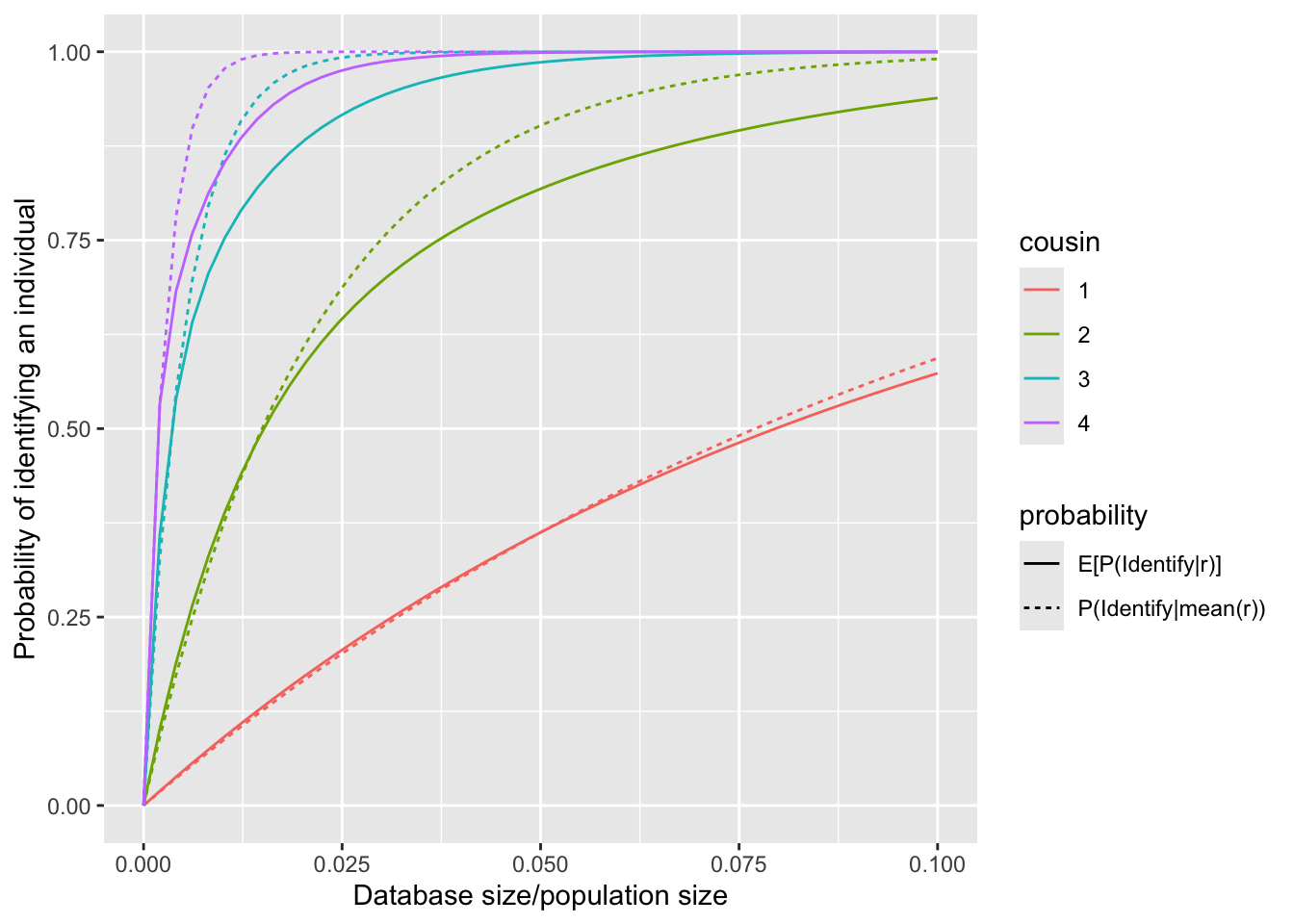 This figure shows that \(P(\text{identify}|\bar{r})>E[P(\text{identify}|r)]\), with the difference becoming more pronounced as the degree of cousinship increases. The underlying mathematical principle responsible for this relationship is Jensen’s Inequality.