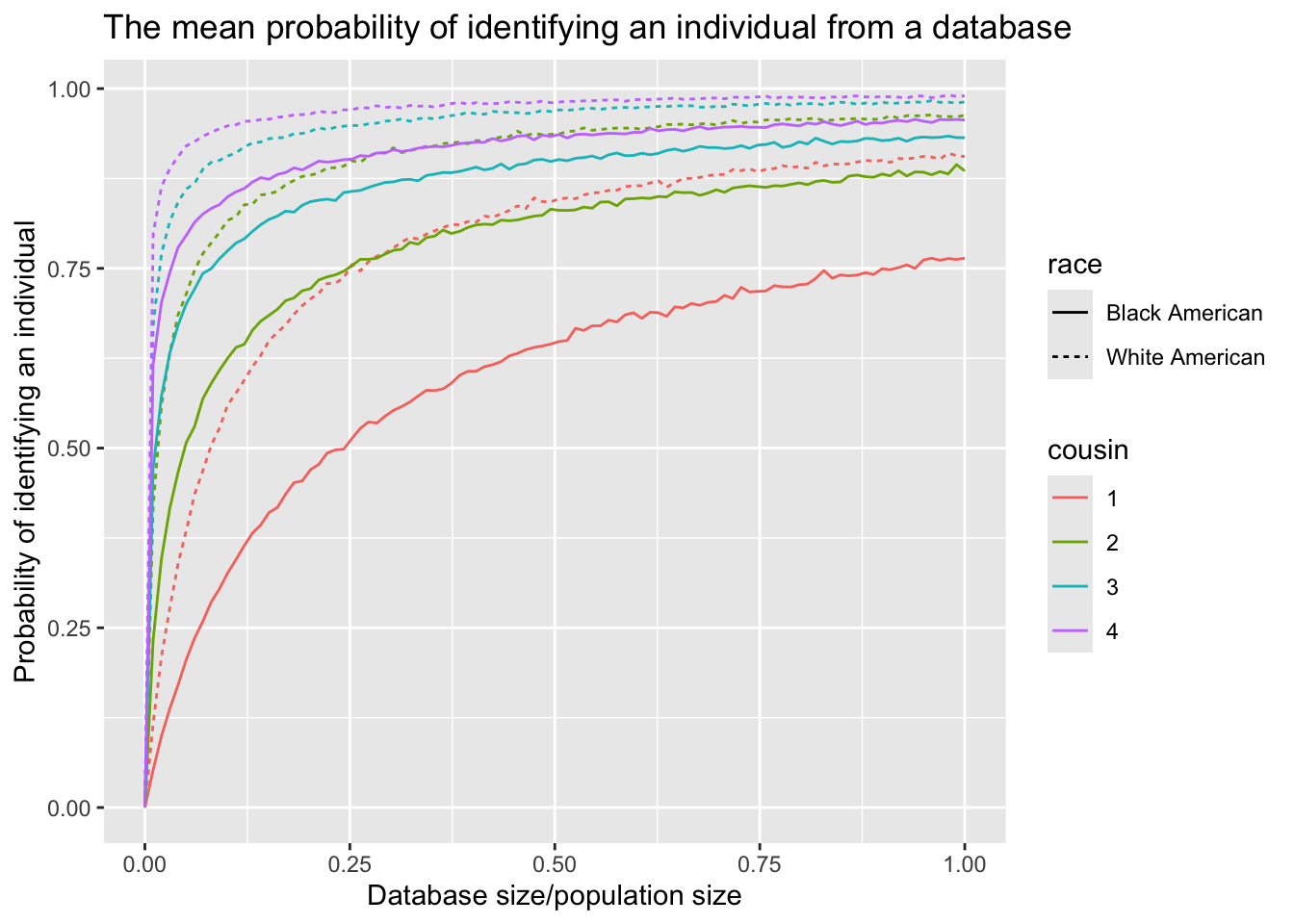 We establish a theoretical binomial model \(\text{Bin}(K,p)\) to calculate the probability of finding a match in a database, where \(K\) is the size of the database and \(p\) is the match probability between a target and another individual. The match probability \(p\) is calculated based on the population size, the database size, racial representation disparities, and the family size distribution.
