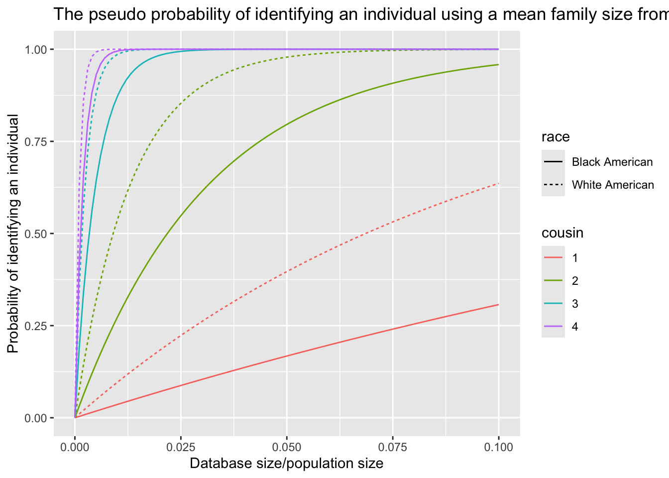 Additionally, we calculate \(P(\text{identify}|\bar{r})\) to make a comparison with \(E[P(\text{identify}|r)]\), where \(\bar{r}\) represents the mean number of children. This probability \(P(\text{identify}|\bar{r})\) is used in the paper of Erlich et al. 2018, if we substitute \(\bar{r}\) by a constant \(r\).
