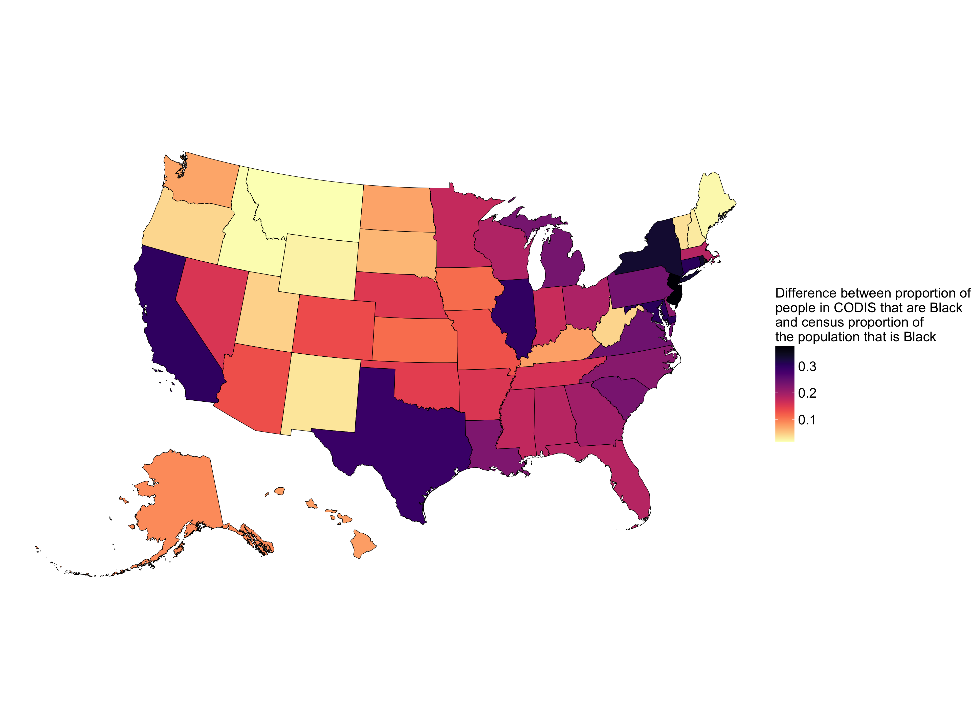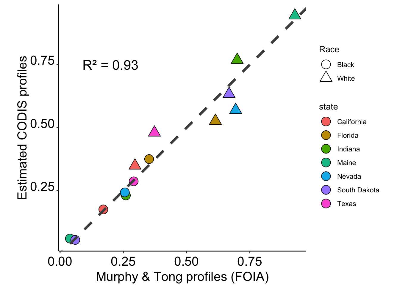 For states in categories (2) and (3), we need to generate an estimation of the racial composition of the SDIS profiles. To generate this estimation, we use the Murphy & Tong FOIA data to create a regression model of proportion of Black and White people in the data set with the following independent variables: the U.S. census proportion of each state for each rate, the percent of the state’s prison population that is each race, an indicator variable for Black/White race, and interaction variables for census proportion by race and prison racial population by race. We use the coefficients from the regression model to make predictions for the remaining states that do not have data available on the racial composition of the DNA databases.