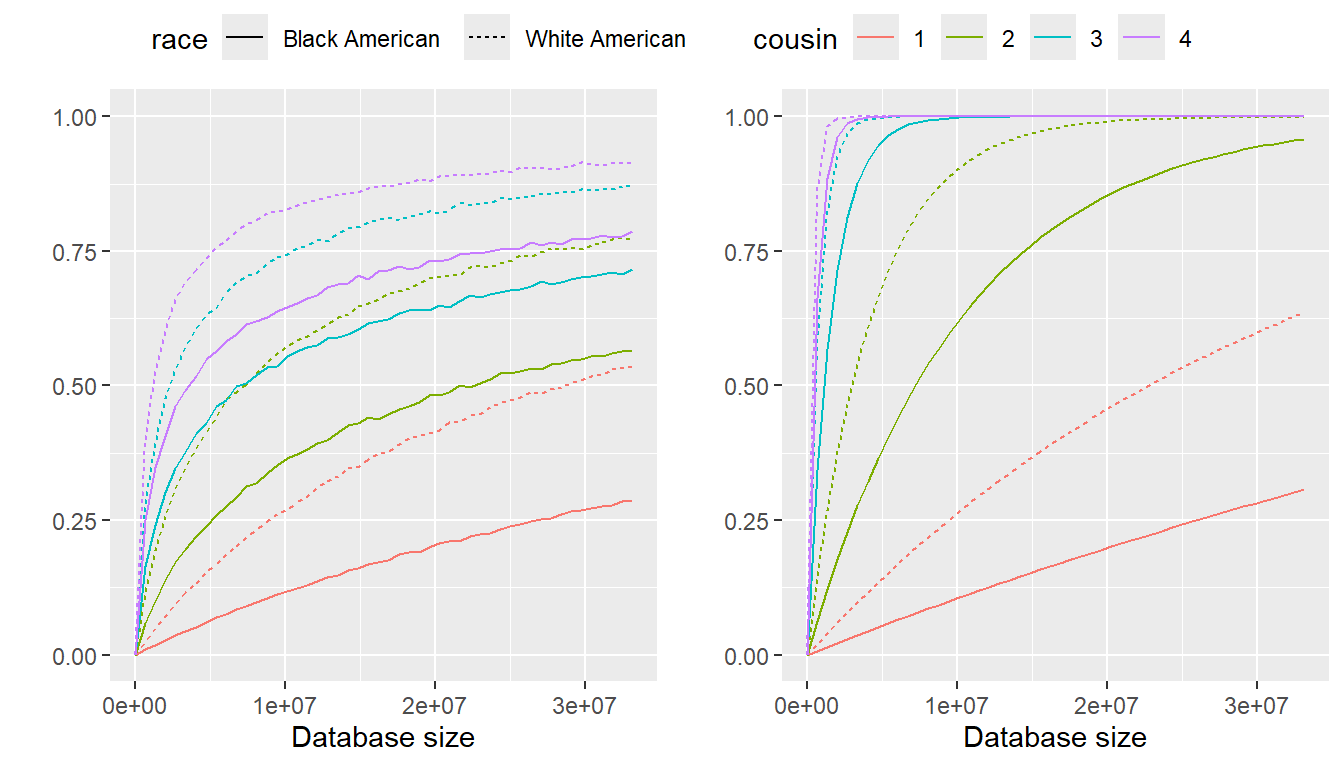 Without accounting for representation disparities, it is interesting to note that the expected identification probability, \(E[P(\text{identify}|r)]\), is higher for Black Americans than for White Americans at lower degrees of cousinship. However, this difference diminishes as the degree of cousinship increases and eventually reverses. A potential explanation is that Black Americans, on average, have larger family sizes than White Americans, leading to higher \(E[P(\text{identify}|r)]\) at lower degrees of cousinship. However, the family size distribution among Black Americans is bimodal, meaning they are significantly more likely than White Americans to have no children. As a result, at higher degrees of cousinship, \(E[P(\text{identify}|r)]\) becomes lower for Black Americans compared to White Americans. A graphical explanation of this pattern is provided in Section 5.