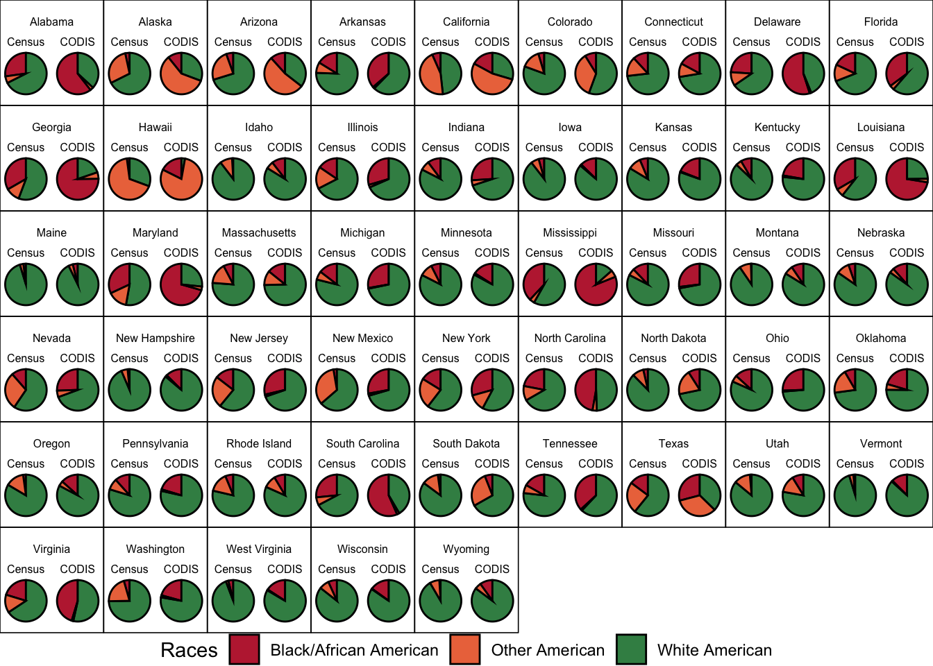relative~difference=\frac{Proportion_{CODIS}-Proportion_{Census}}{Proportion_{Census}}.