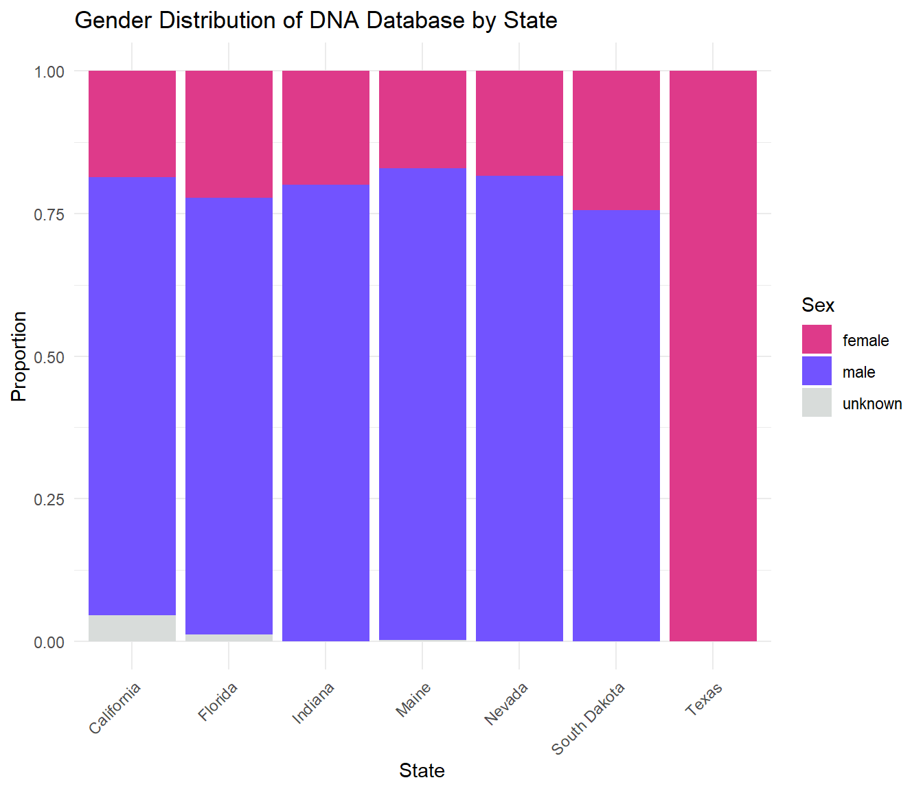 The following bar chart shows the gender breakdown of the state DNA databases.