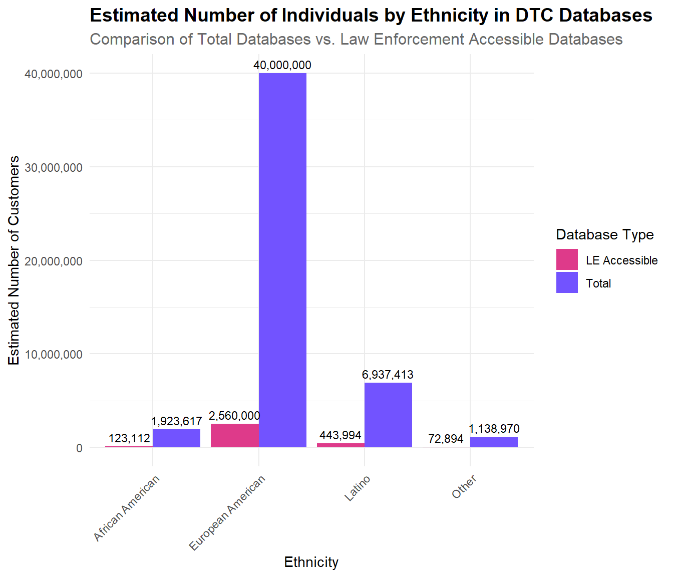 Finally, we synthesize this information to estimate the number and proportion of African Americans and European Americans represented across all DTC databases, as well as those accessible to law enforcement.