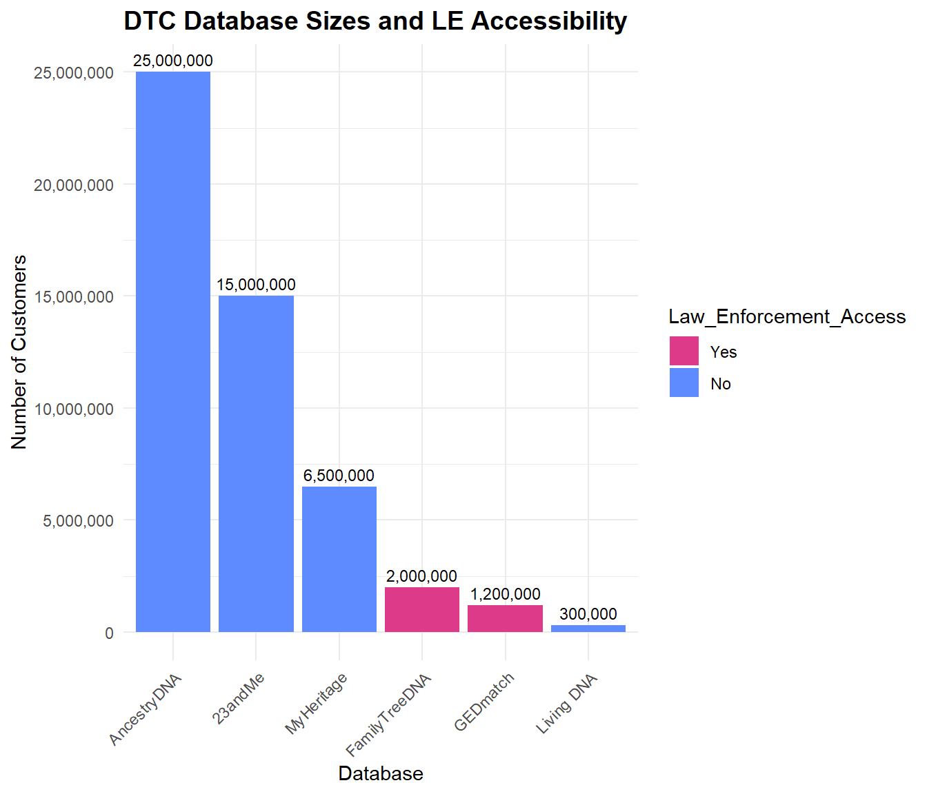 The following bar chart displays both law enforcement accessibility and total numbers for each of the major DTC databases.