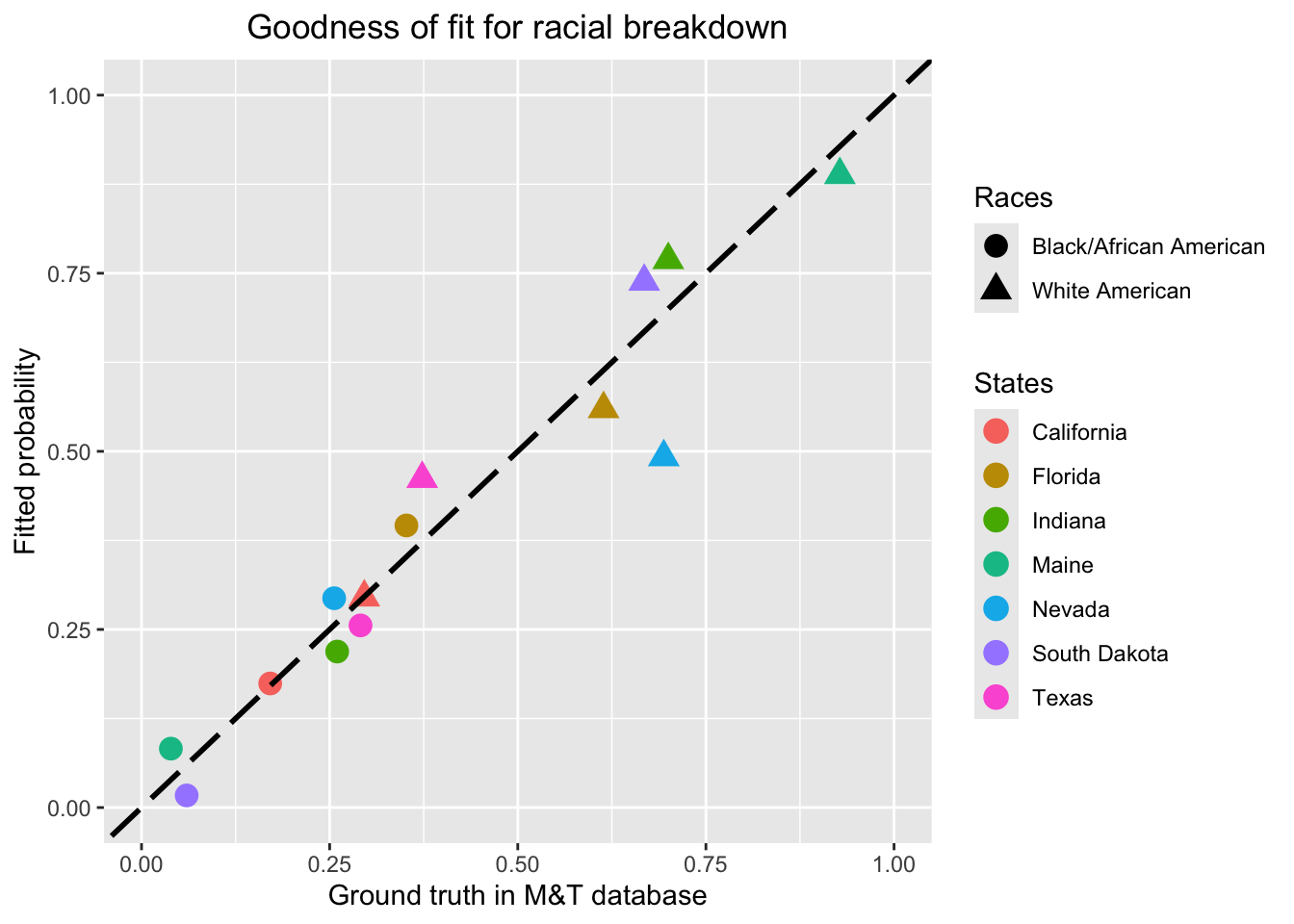 \pi_{black}=(1-p_1)p_2,\quad \pi_{other}=(1-p_1)(1-p_2).\] We run