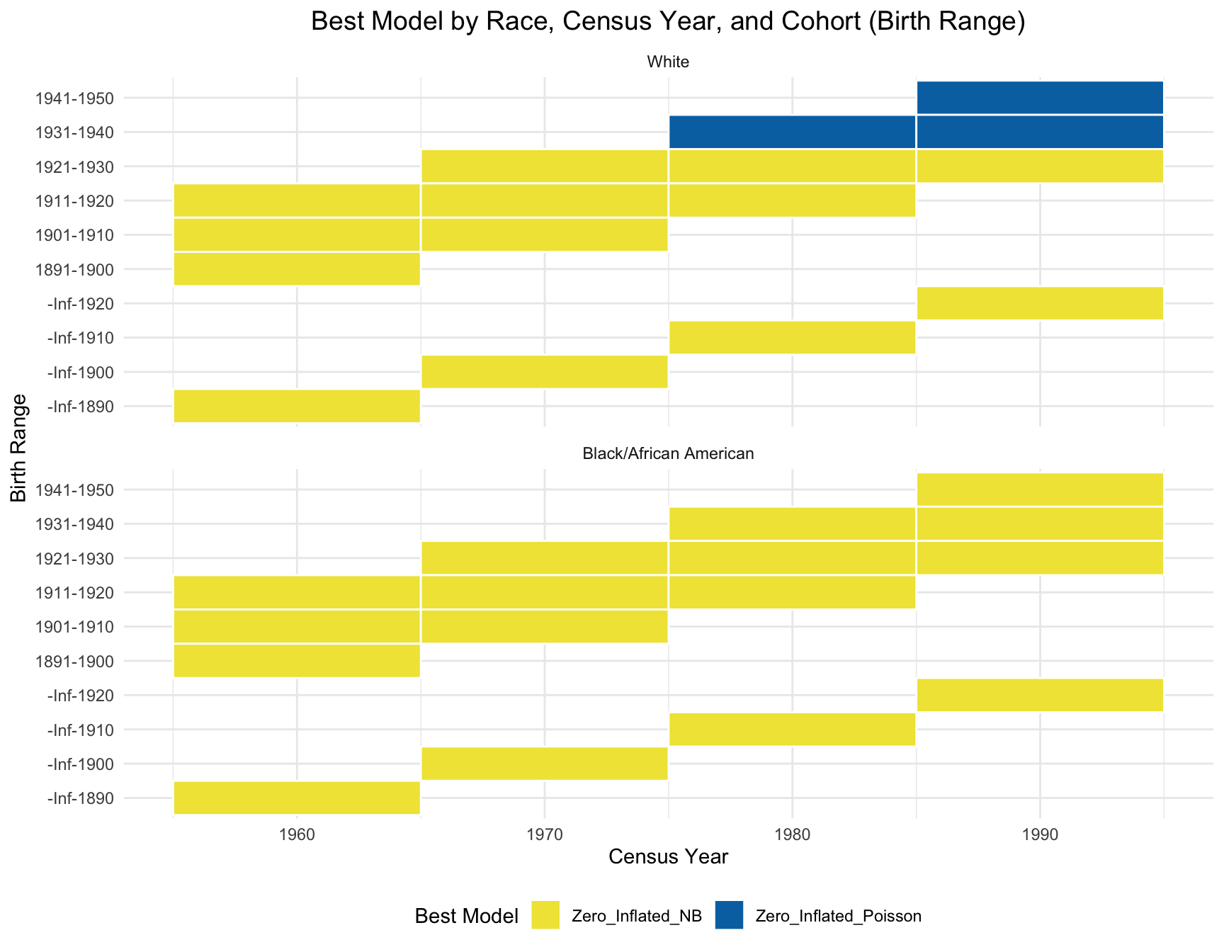 title = "Best Model(siblings) by Race, Census Year, and Cohort(Birth Range)",