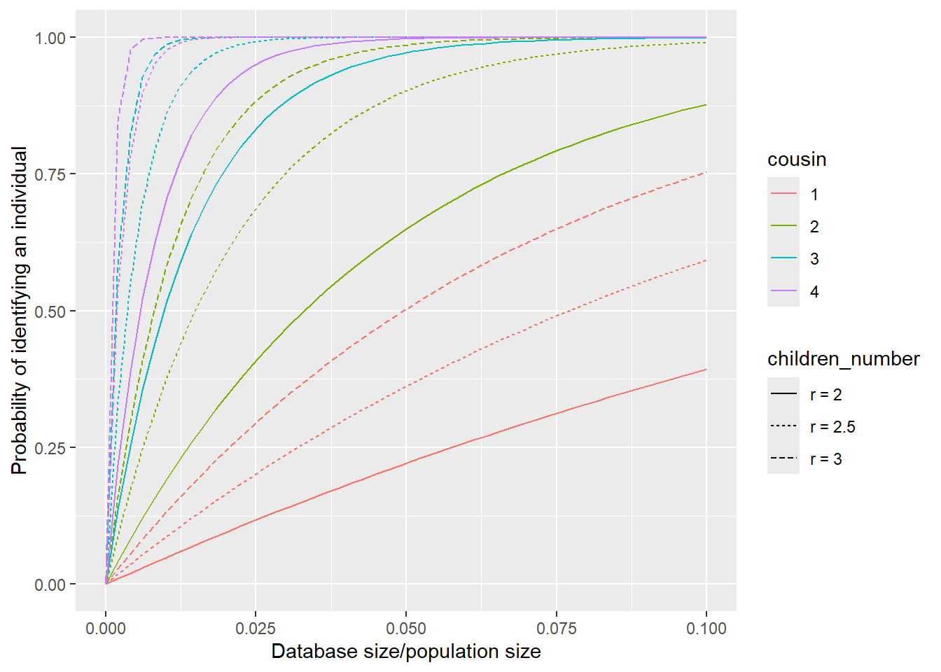 Additionally, since \(r\) is a random variable, we calculate \(P(\text{identify}|\bar{r})\) to make a comparison with \(E[P(\text{identify}|r)]\), where \(\bar{r}\) represents the mean number of children. This probability \(P(\text{identify}|\bar{r})\) is used in the paper of Erlich et al. 2018, if we substitute \(\bar{r}\) by a constant \(r\).