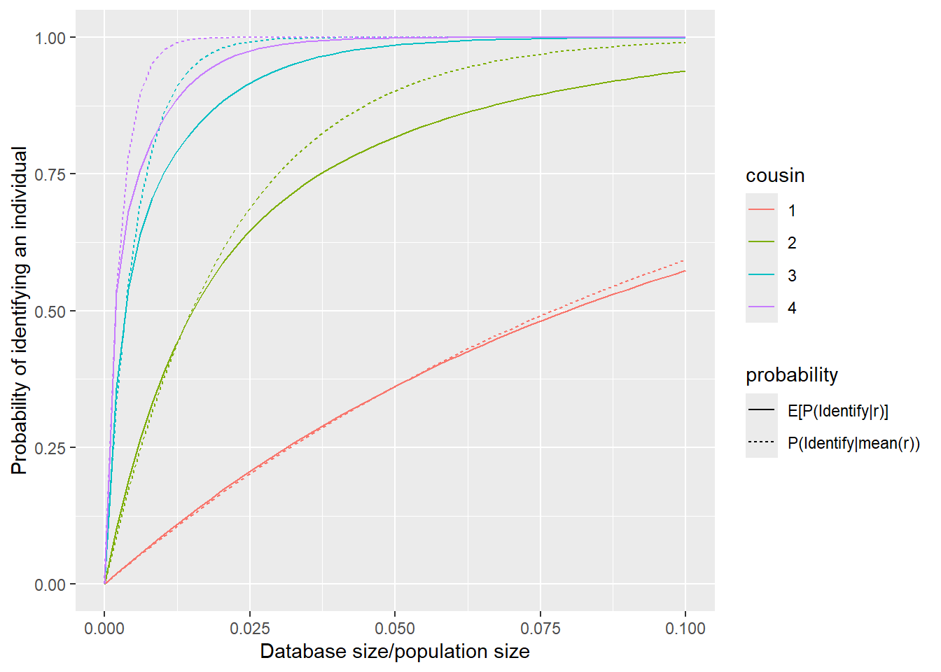 This figure shows that \(P(\text{identify}|\bar{r})>E[P(\text{identify}|r)]\), with the difference becoming more pronounced as the degree of cousinship increases. The underlying mathematical principle responsible for this relationship is Jensen’s Inequality.