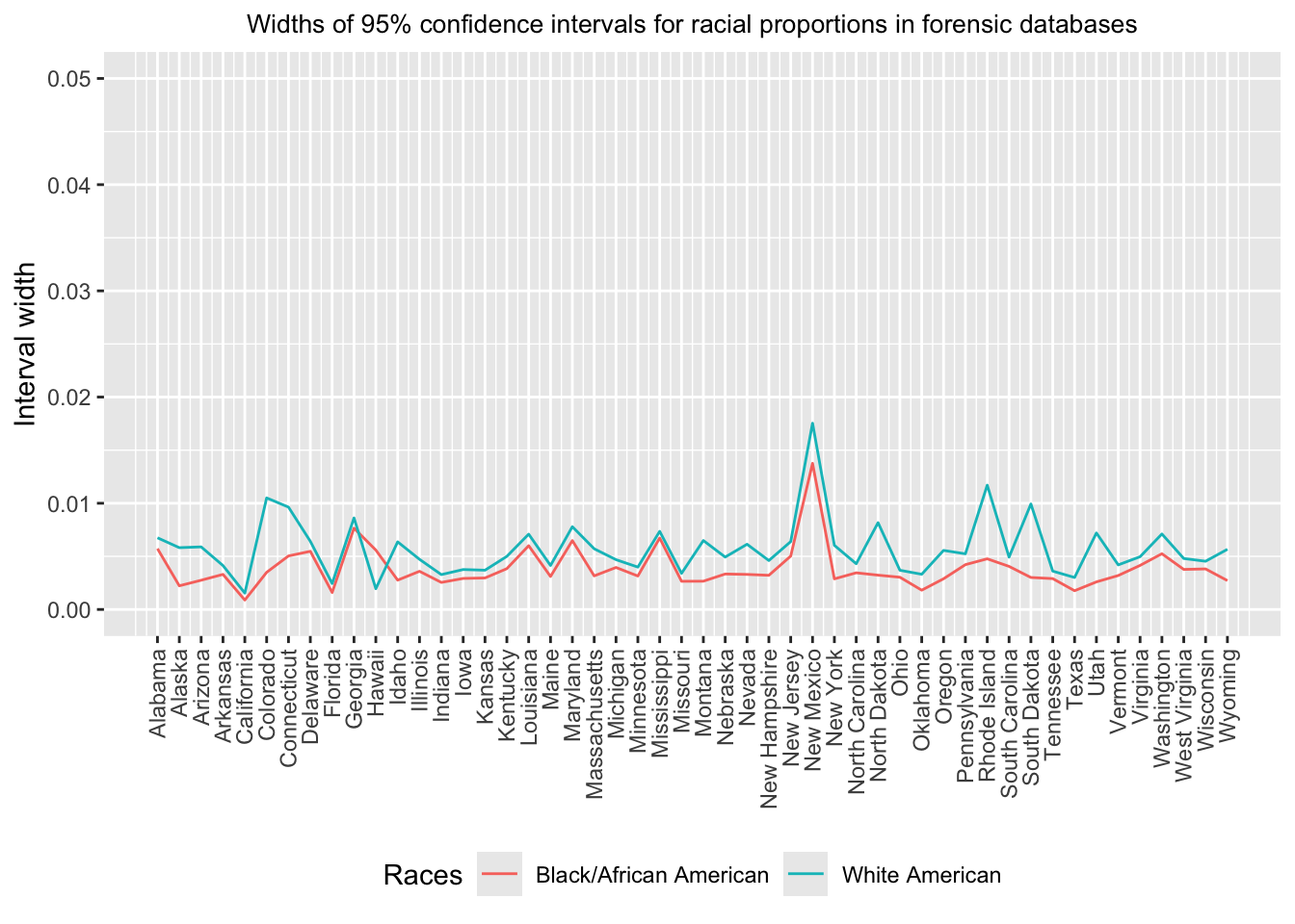 for the black proportion in Census, where \(c_{1-\alpha/2}\) is the \(1-\alpha/2\) quantile of the standard