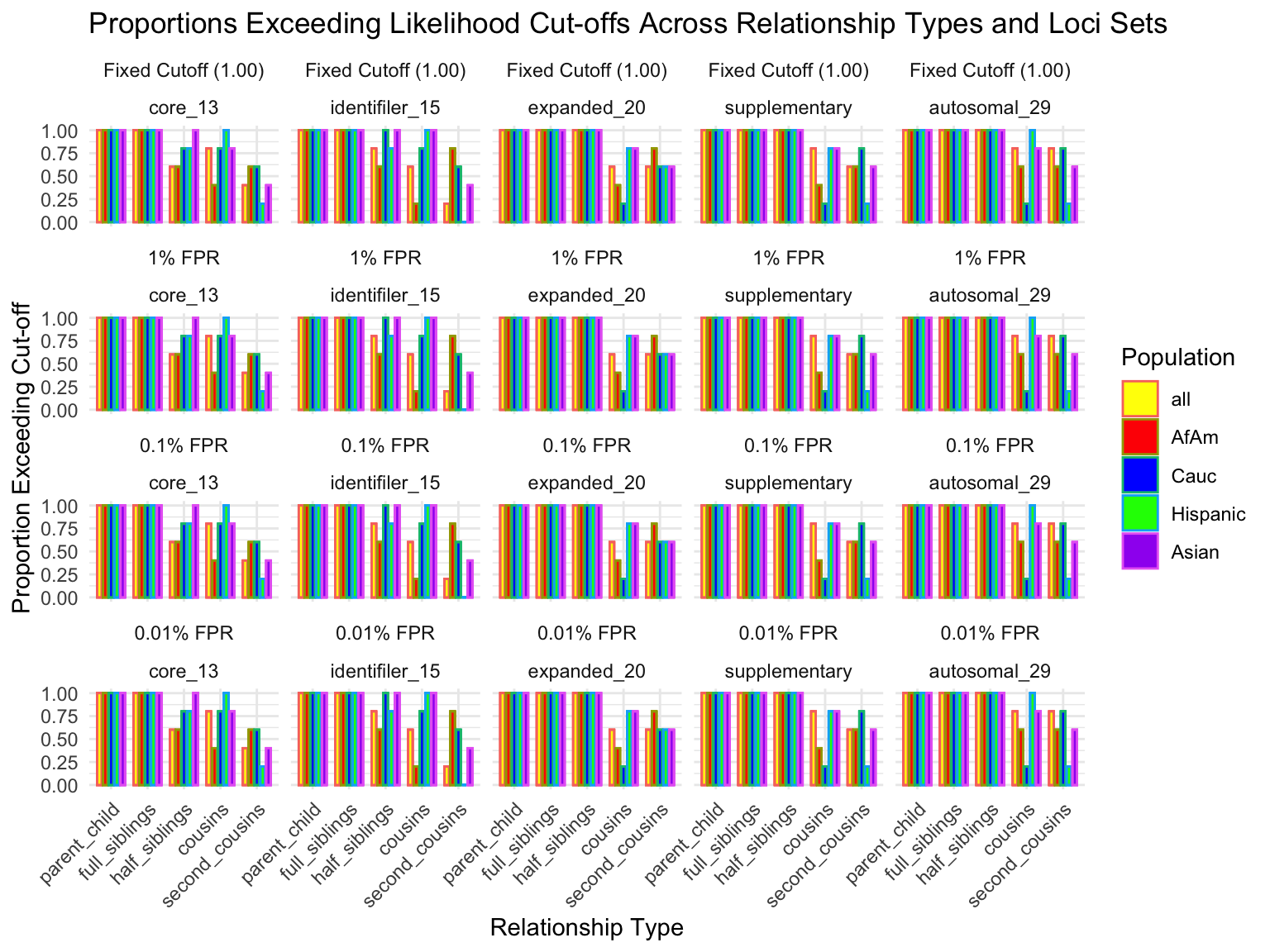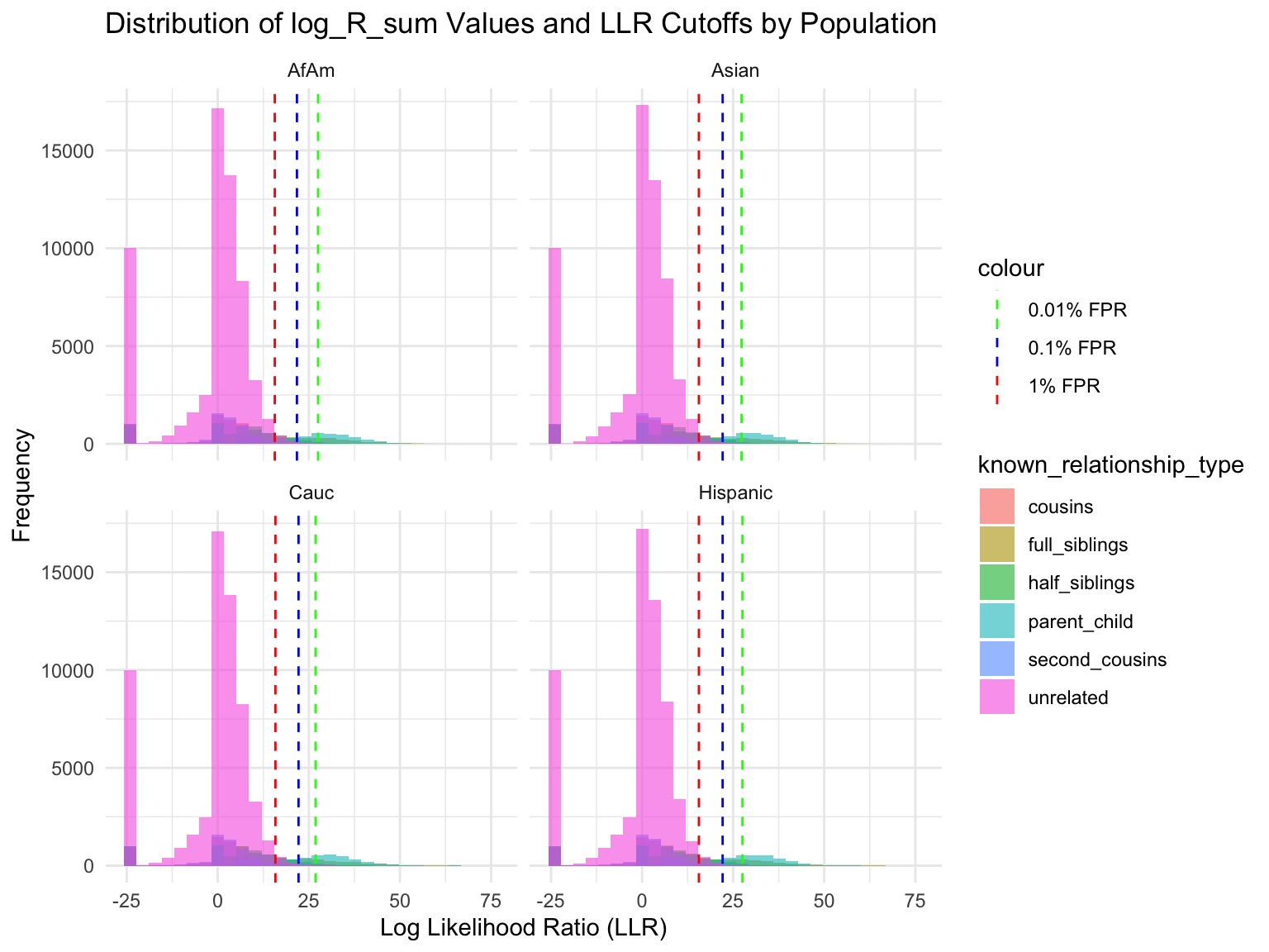 We will simulate pairs of individuals with known relationships (e.g., parent-child, siblings), including unrelated individuals, based on the specified parameters. We will then calculate the likelihood ratio for each pair of individuals based on the simulated genotypes and known relationships.